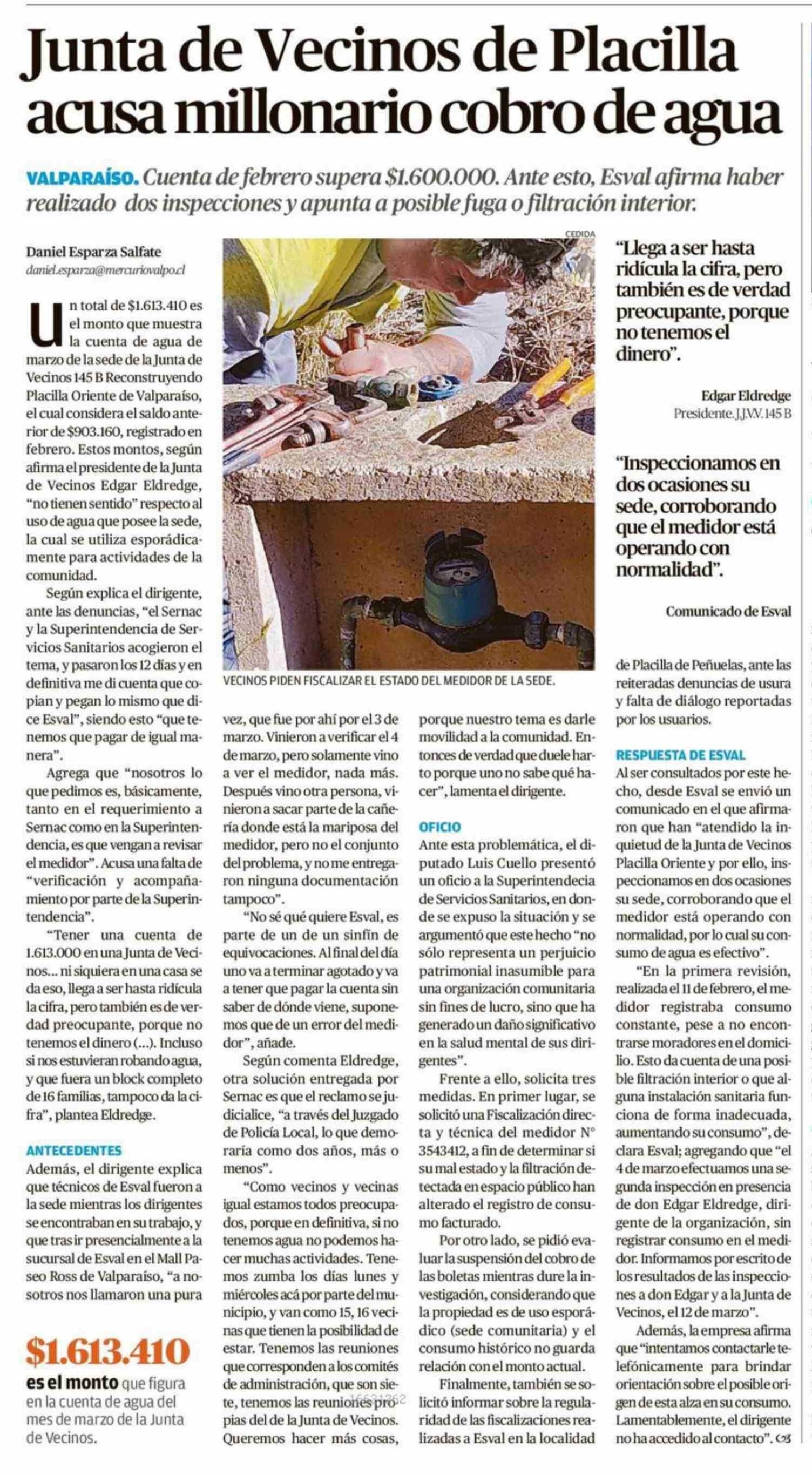 Junta de Vecinos de Placilla acusa millonario cobro de agua 04-04-2026 El Mercurio de Valparaíso |