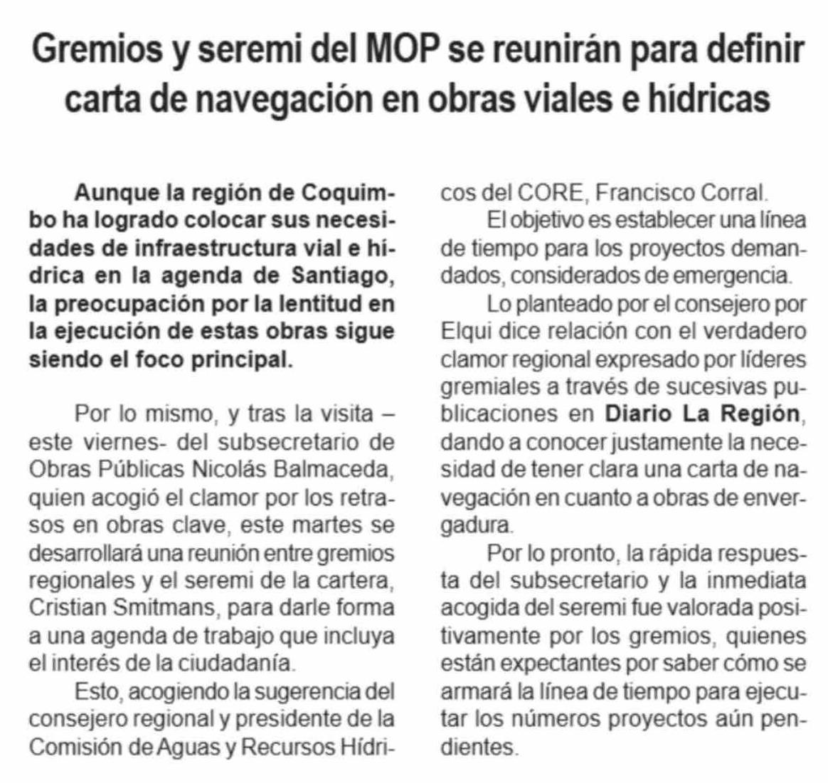 | Título: | Gremios y seremi del MOP se reunirán para definir carta de navegación en obras viales e hídricas |