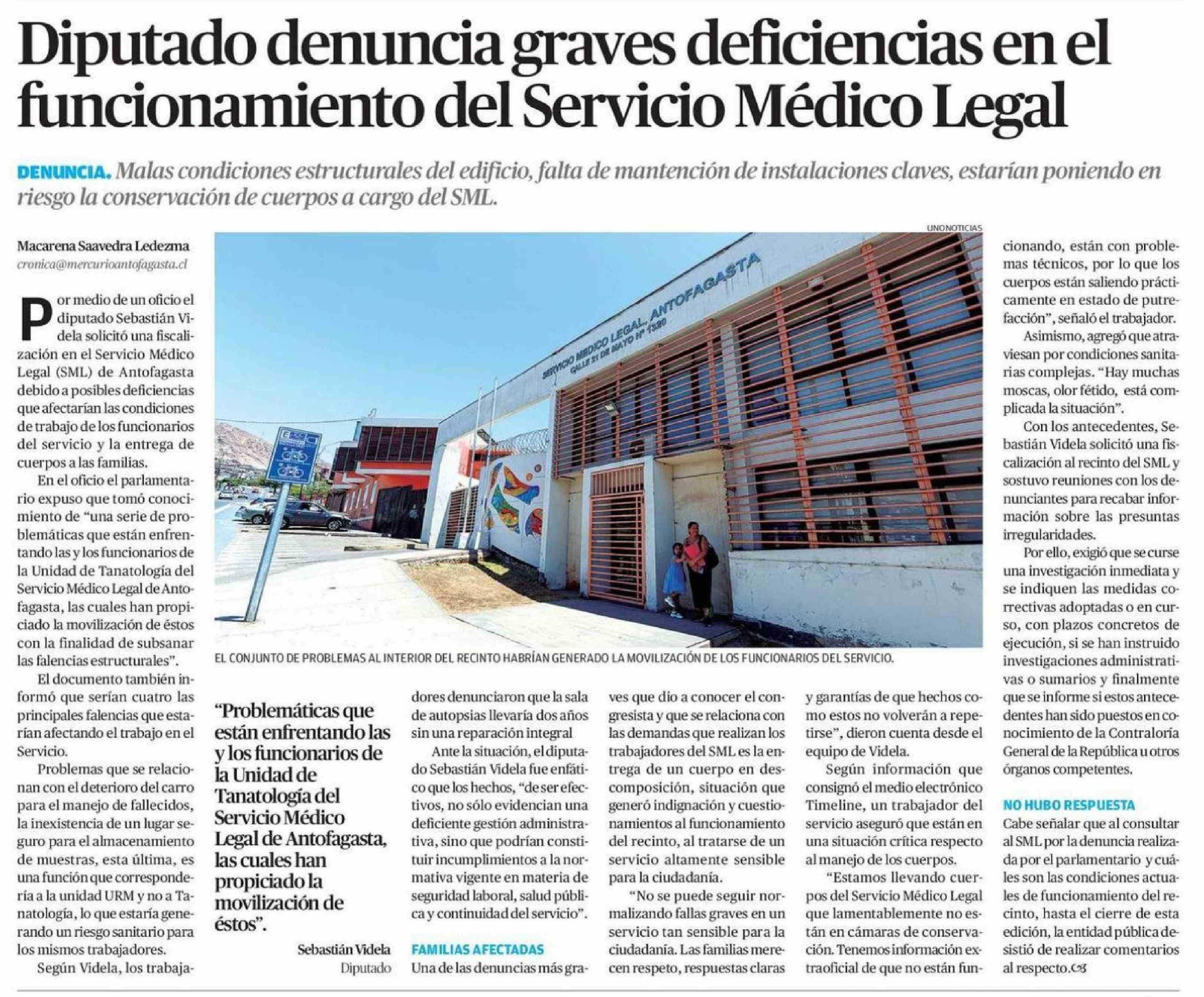 Diputado denuncia graves deficiencias en el funcionamiento del Servicio Médico Legal 07-01-2026 El Mercurio de Antofagasta |