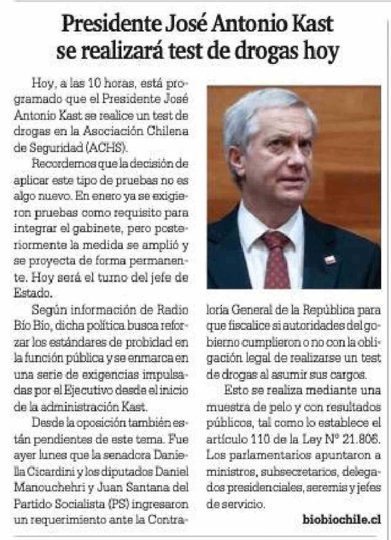 | Título: | Presidente José Antonio Kast se realizará test de drogas hoy |