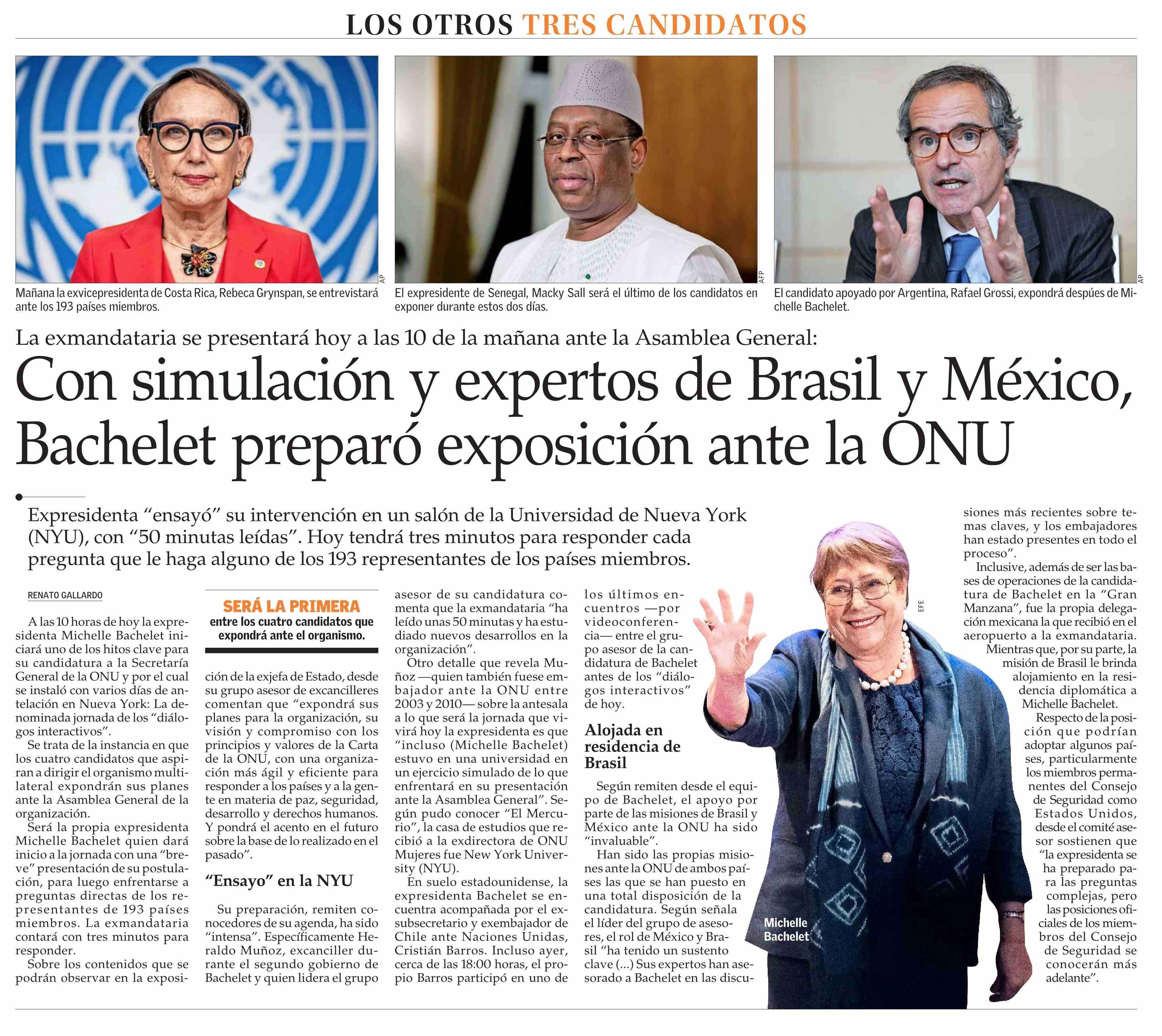 Con simulación y expertos de Brasil y México, Bachelet preparó exposición ante la ONU 21-04-2026 El Mercurio |