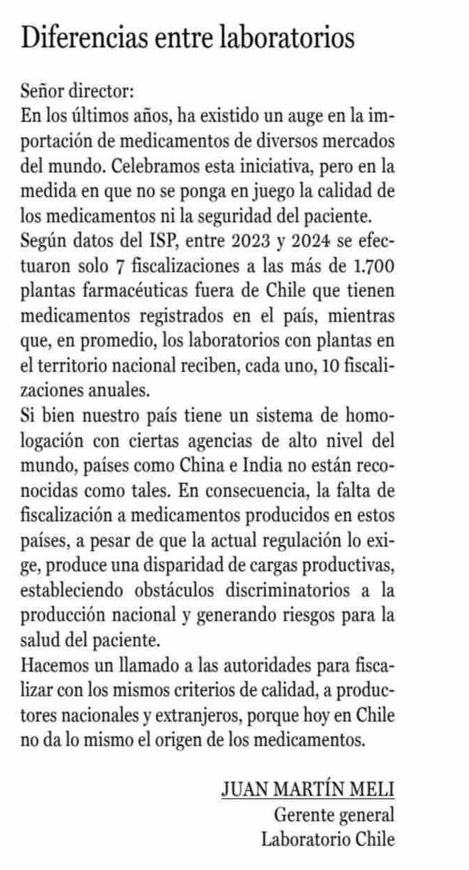 CARTAS: Diferencias entre laboratorios 28-05-2025 La Prensa de Curicó |