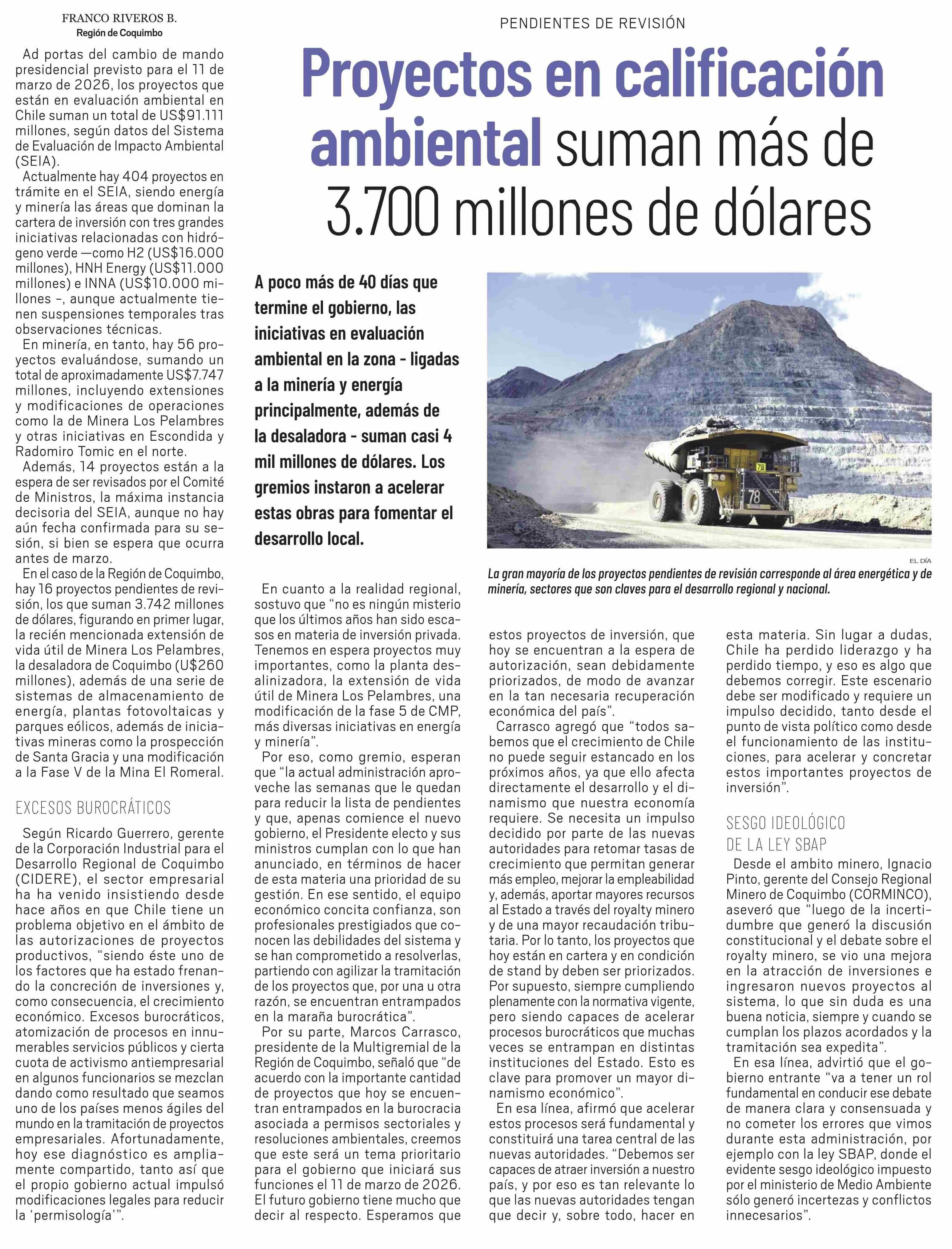 Título: Proyectos en calificación ambiental suman más de 3.700 millones de dólares