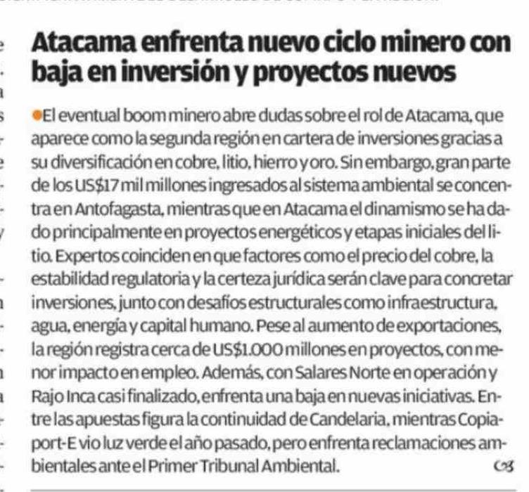 | Título: | Atacama enfrenta nuevo ciclo minero con baja en inversión y proyectos nuevos .El eventual boom minero abre dudas sobre el rol de Atacama, que aparece como la segunda región en cartera de inversiones gracias a su diversificación en cobre, litio, hierro y oro. Sin embargo, gran parte de los US$17 mil |