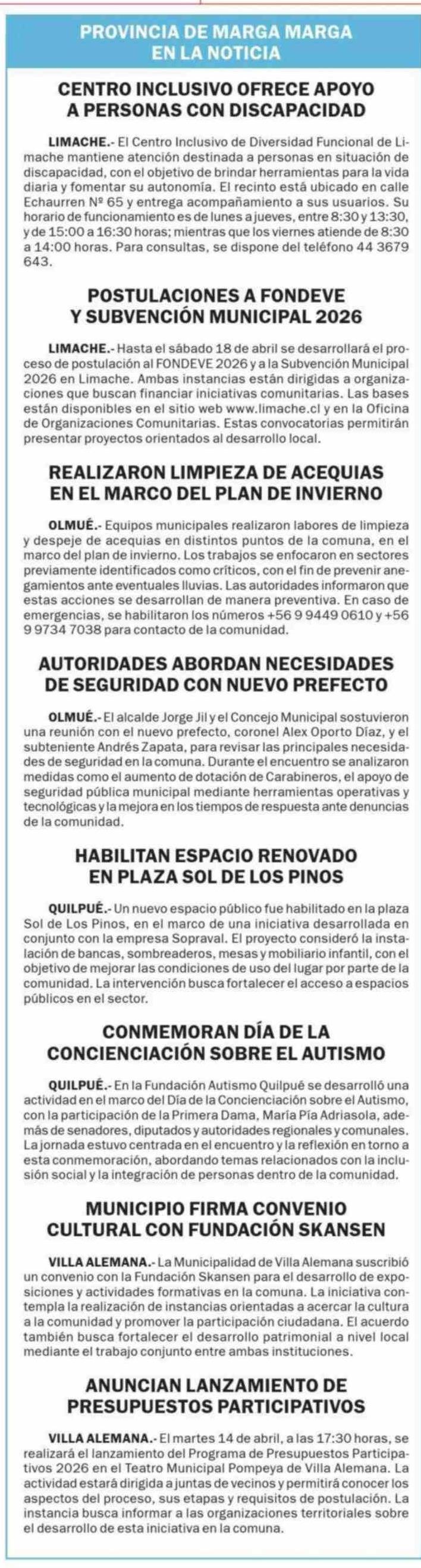 PROVINCIA DE MARGA MARGA EN LA NOTICIA 10-04-2026 El Observador |