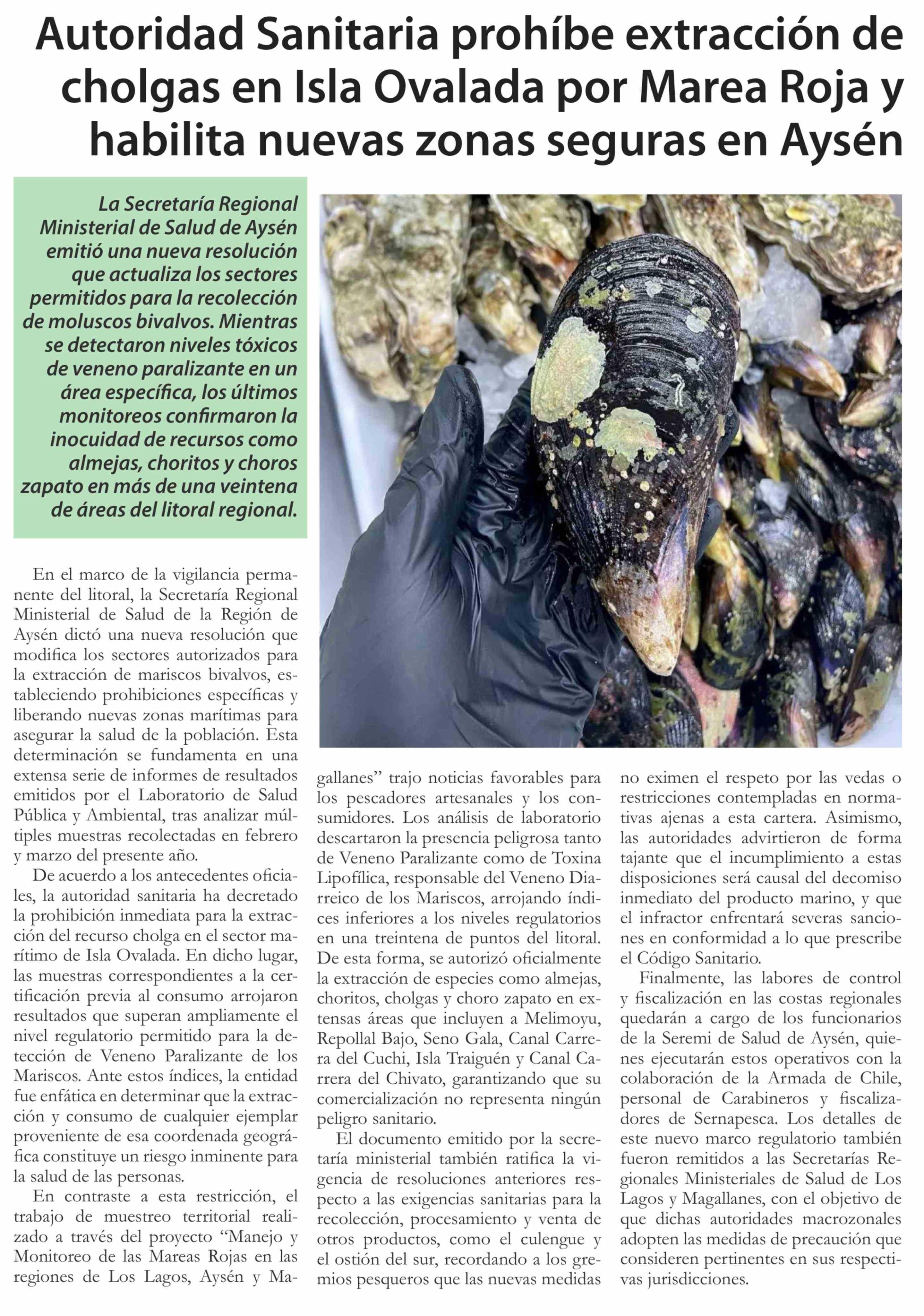 Título: Autoridad Sanitaria prohíbe extracción de cholgas en Isla Ovalada por Marea Roja y habilita nuevas zonas seguras en Aysén