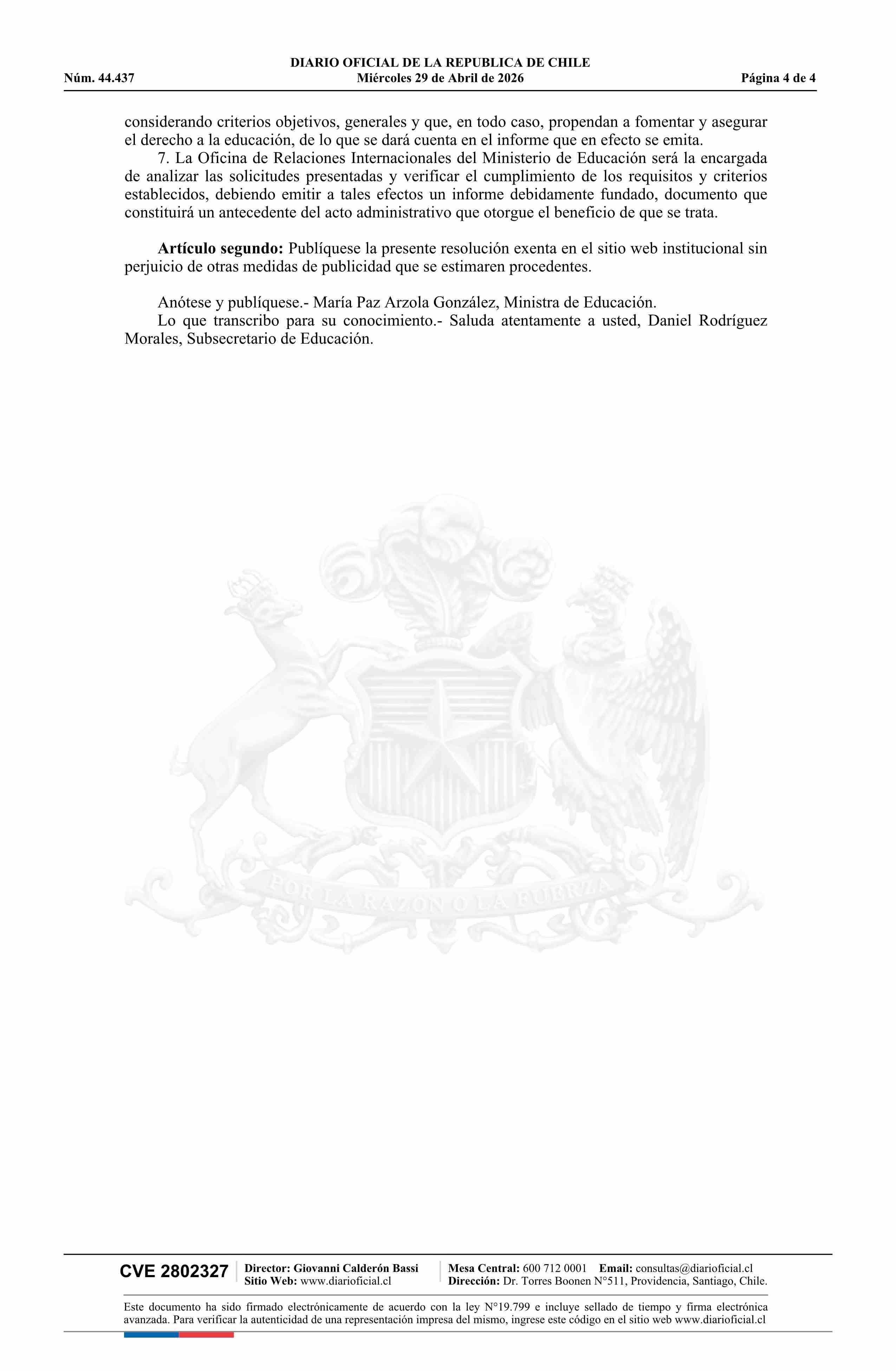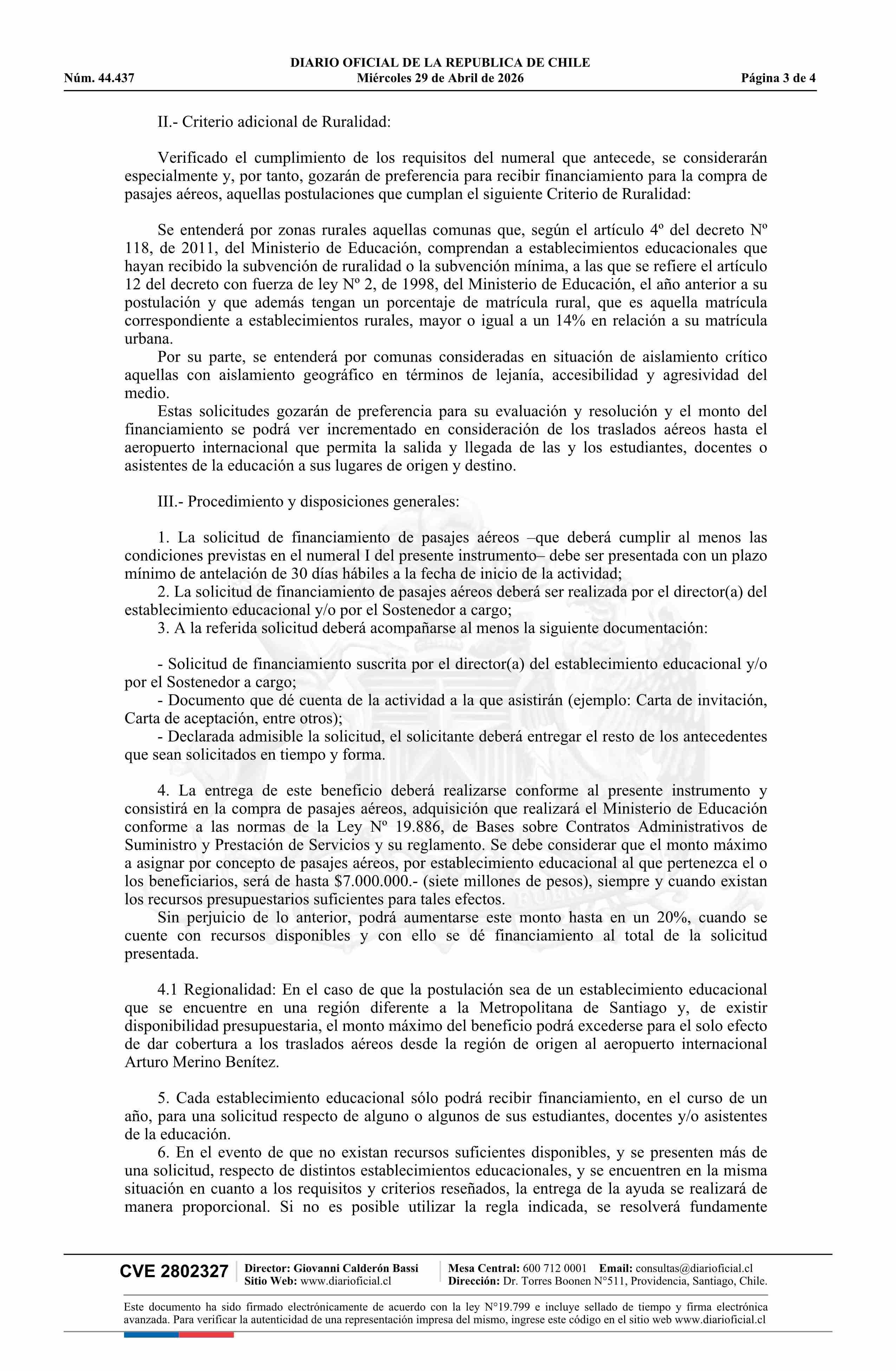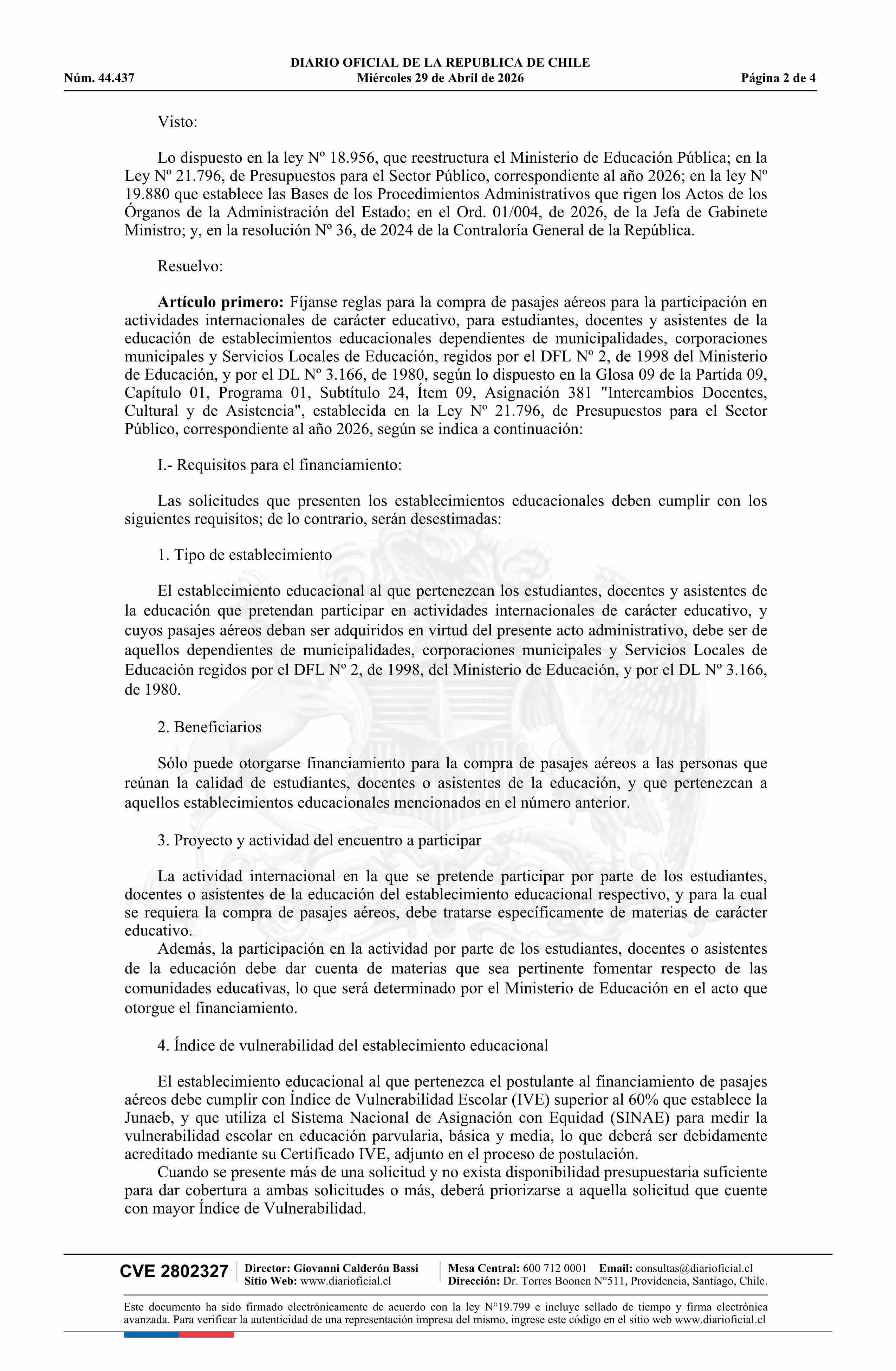 | Título: | Resolución exenta número 1.767, de 2026.- Fija reglas para el financiamiento de la compra de pasajes aéreos para la participación en actividades internacionales de carácter educativo, para estudiantes, docentes y asistentes de la educación de establecimientos educacionales dependientes de municipali |