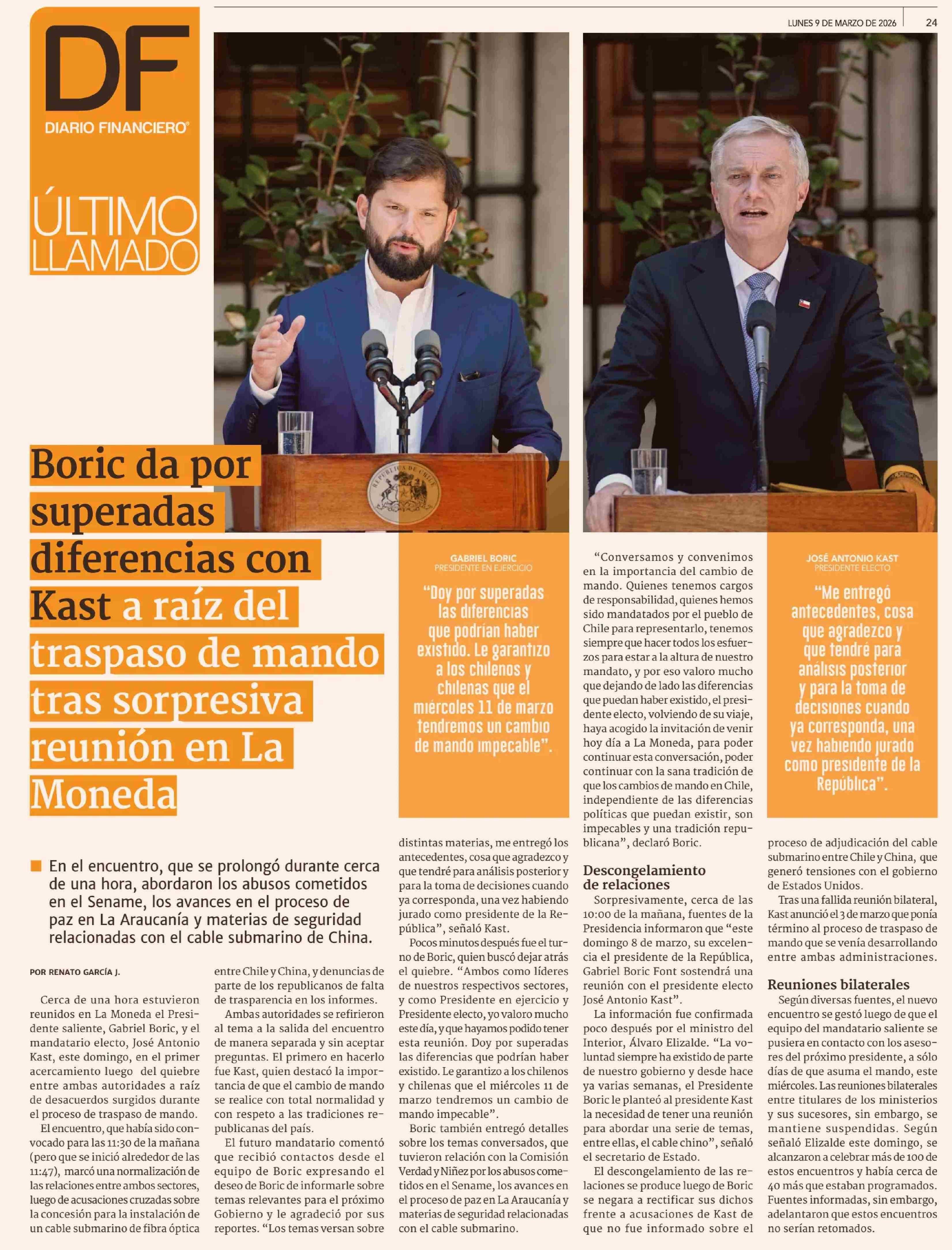 Boric da por superada diferencias con Kast a raí del traspaso de mando tras sorpresiva reunión en La Moneda 09-03-2026 Diario Financiero |