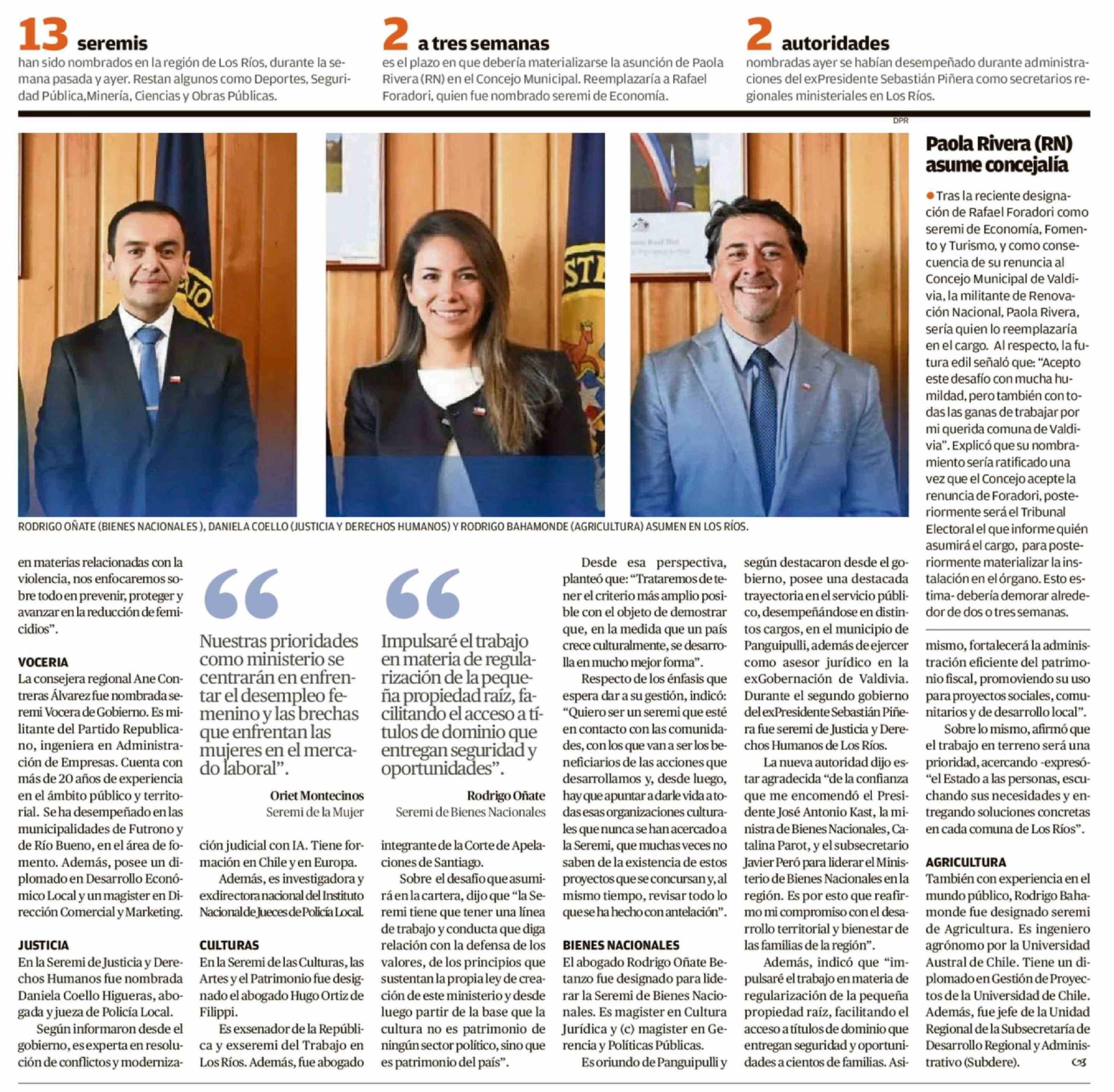 Gobierno nombró ayer a otros seis seremis en la región de Los Ríos 31-03-2026 Diario Austral Región de Los Ríos |