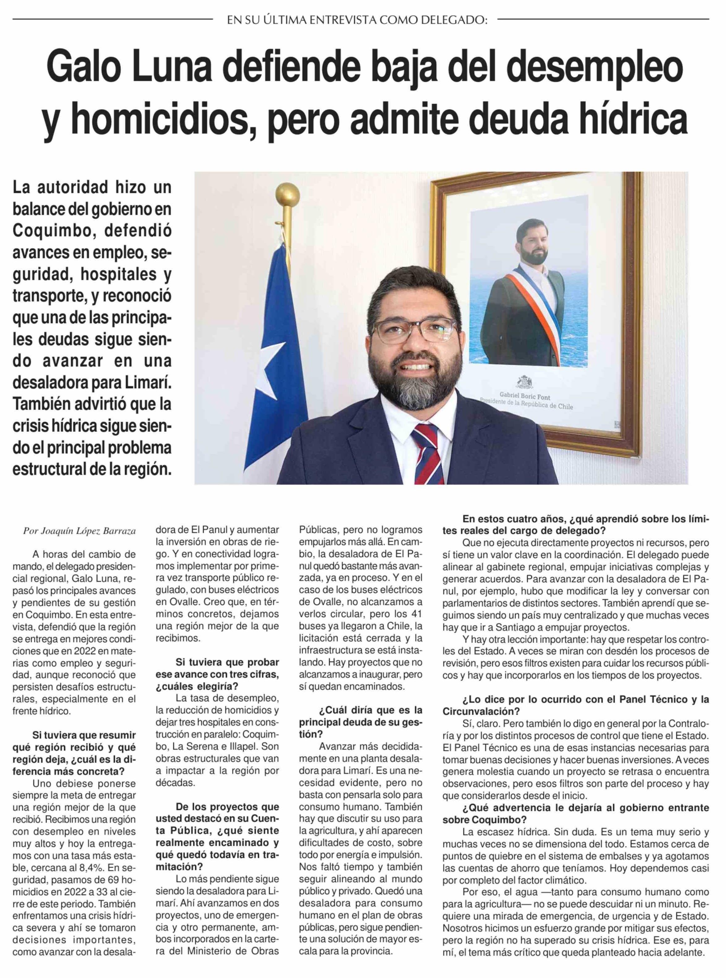 Título: Galo Luna defiende baja del desempleo y homicidios, pero admite deuda hídrica