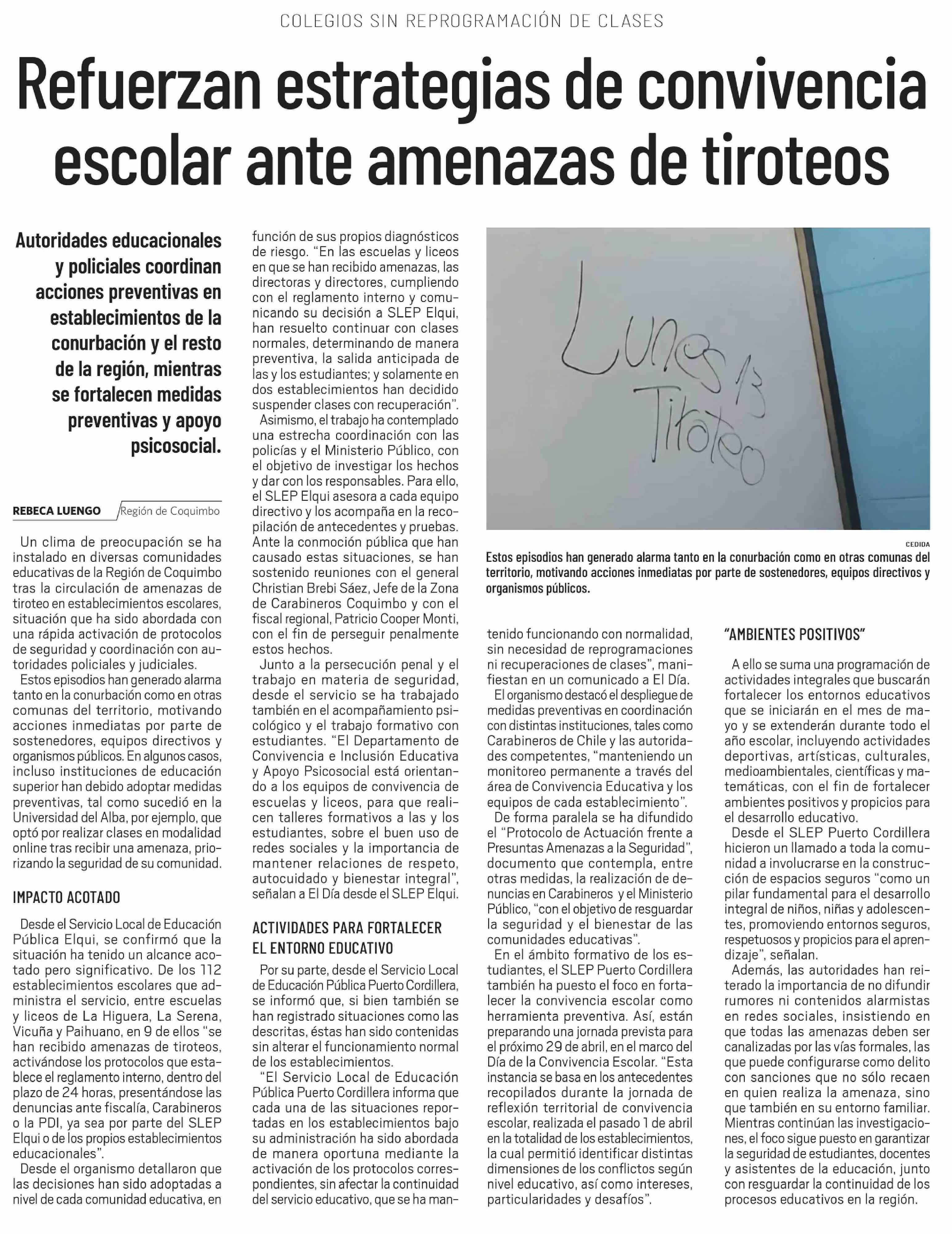 Refuerzan estrategias de convivencia escolar ante amenazas de tiroteos 20-04-2026 El Día |