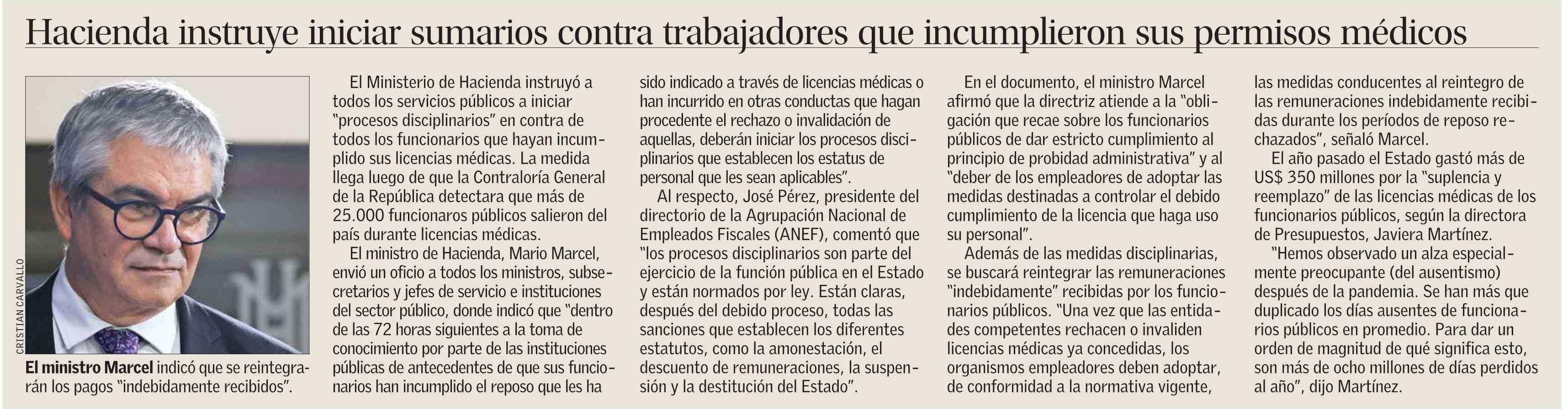 Hacienda instruye iniciar sumarios contra trabajadores que incumplieron sus permisos médicos 22-05-2025 El Mercurio |