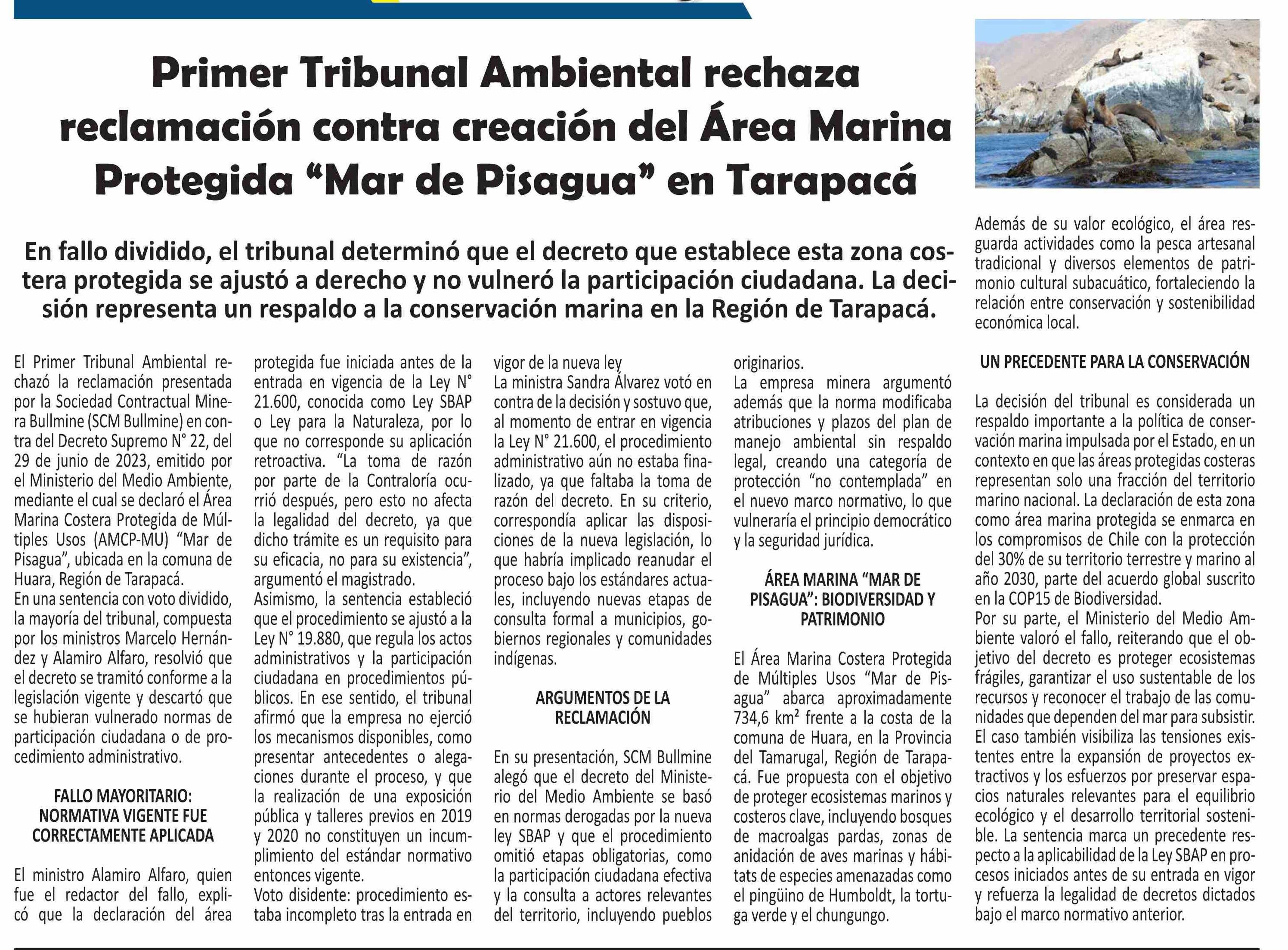 Primer Tribunal Ambiental rechaza reclamación contra creación del Área Marina Protegida “Mar de Pisagua” en Tarapacá 07-04-2025 El Longino |