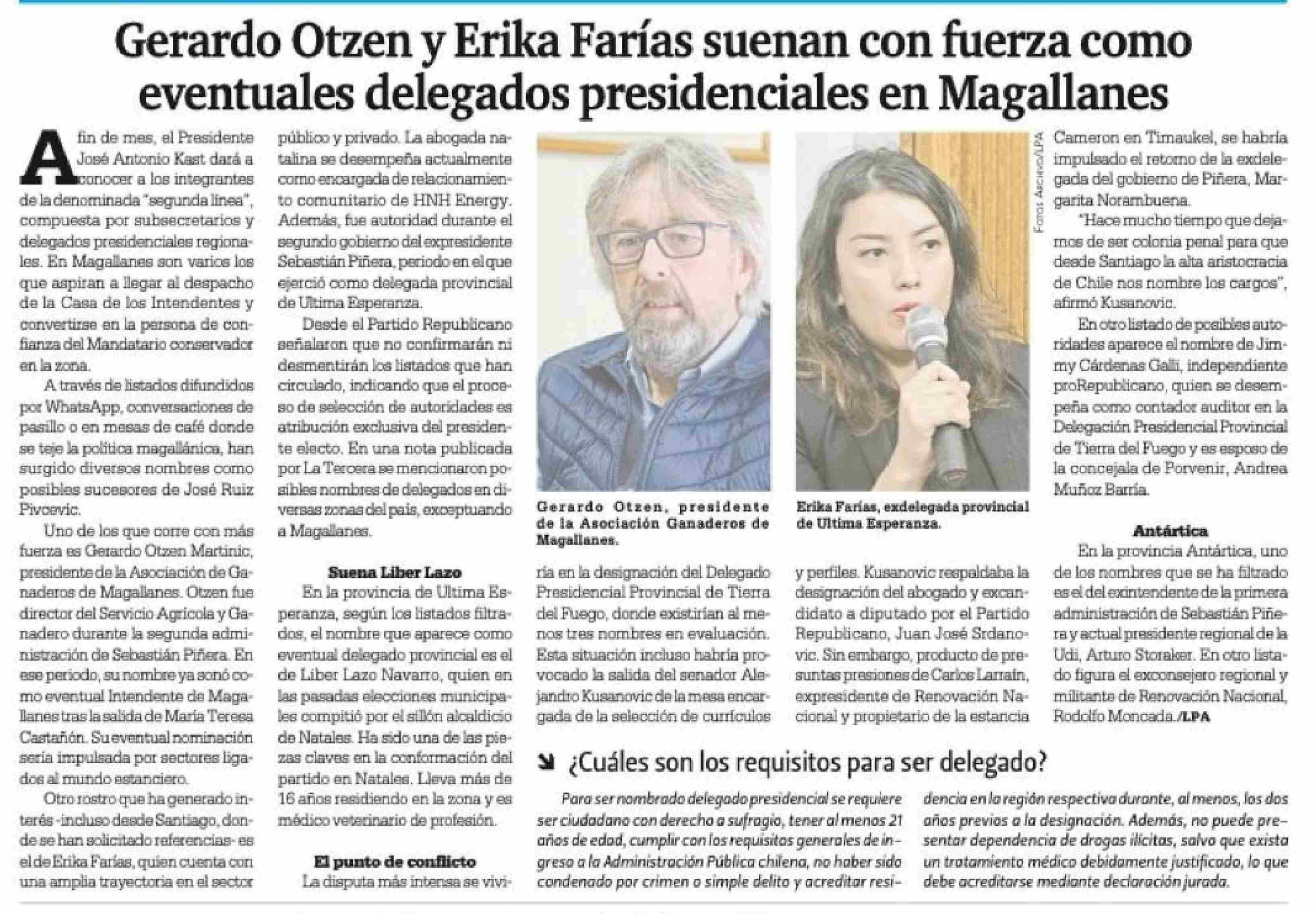 Gerardo Otzen y Erika Farías suenan con fuerza como eventuales delegados presidenciales en Magallanes 24-01-2026 La Prensa Austral |