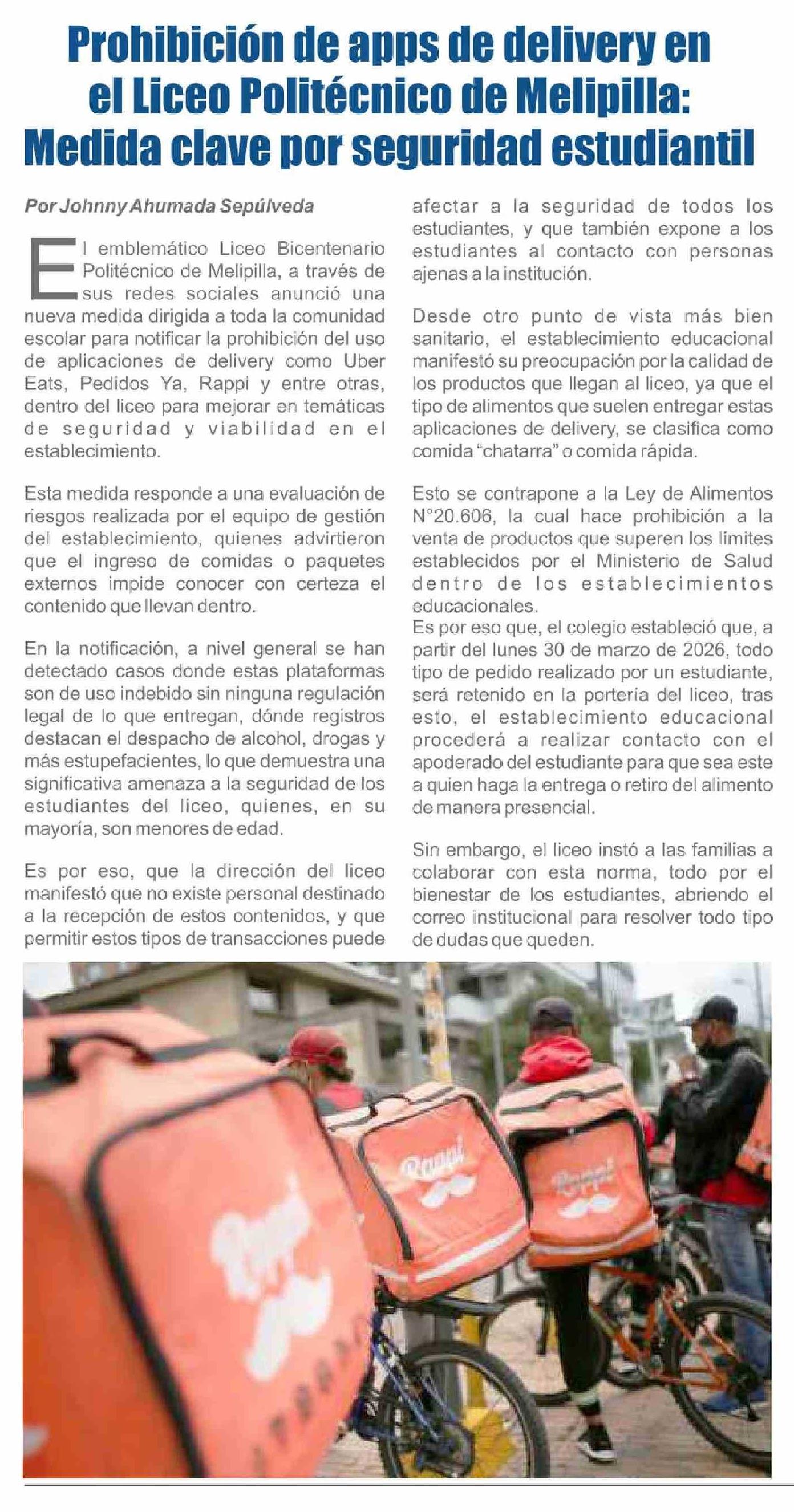 | Título: | Prohibición de apps de delivery en el Liceo Politécnico de Melipilla: Medida clave por seguridad estudiantil |