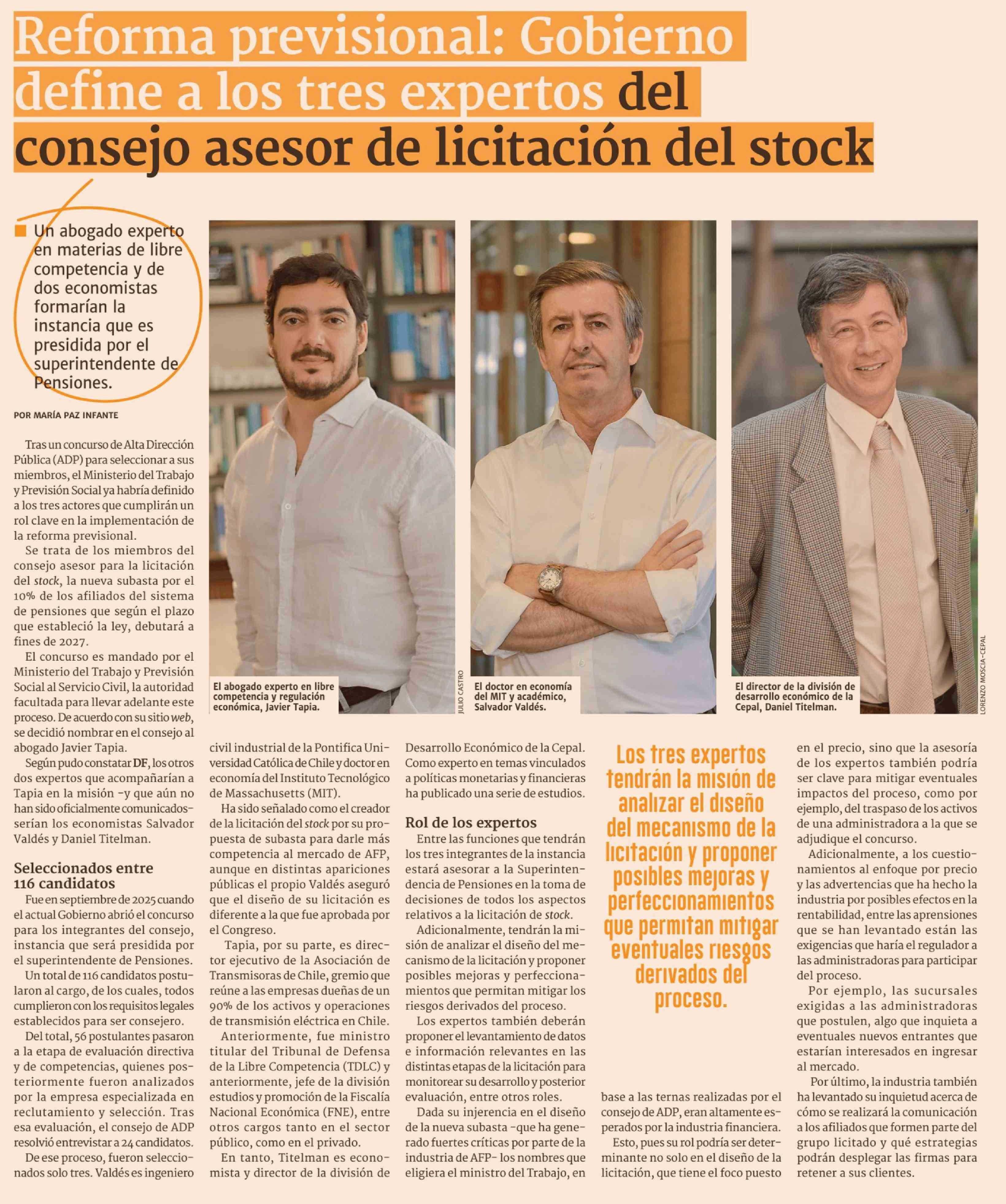 Título: Reforma previsional: Gobierno define a los tres expertos del consejo asesor de licitación del stock