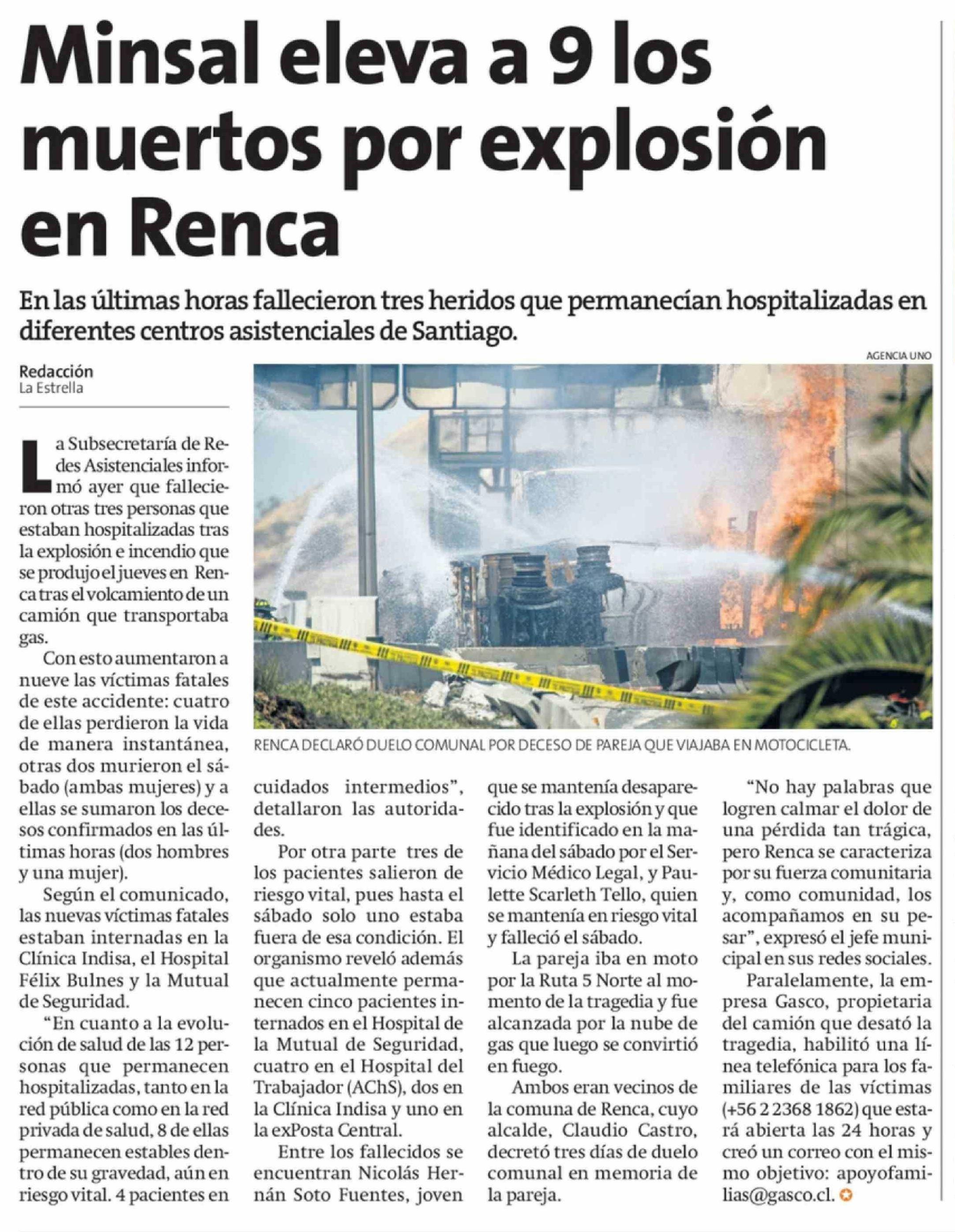 Minsal eleva a 9 los muertos por explosión en Renca 23-02-2026 La Estrella de Antofagasta |