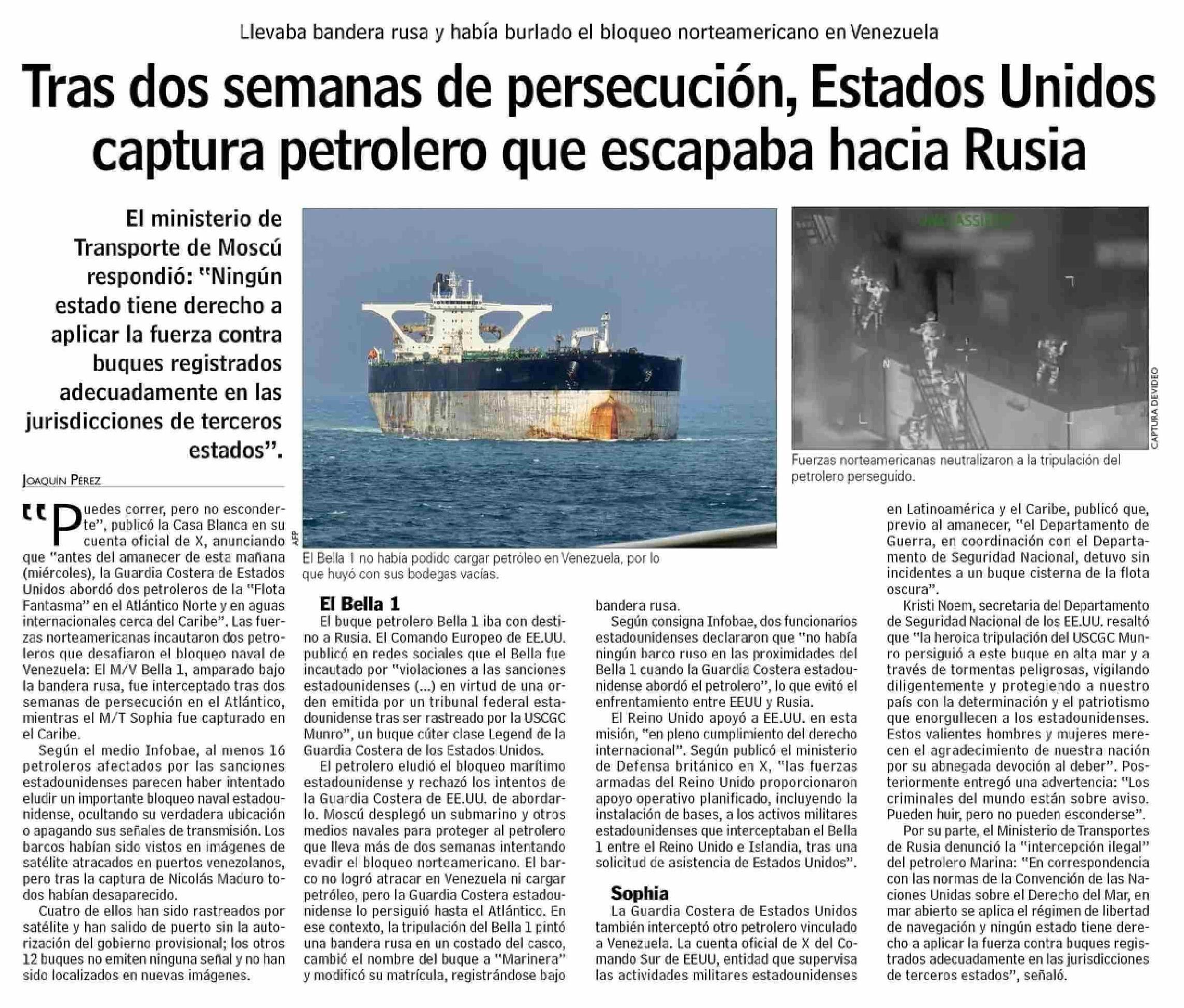 Título: Tras dos semanas de persecución, Estados Unidos captura petrolero que escapaba hacia Rusia