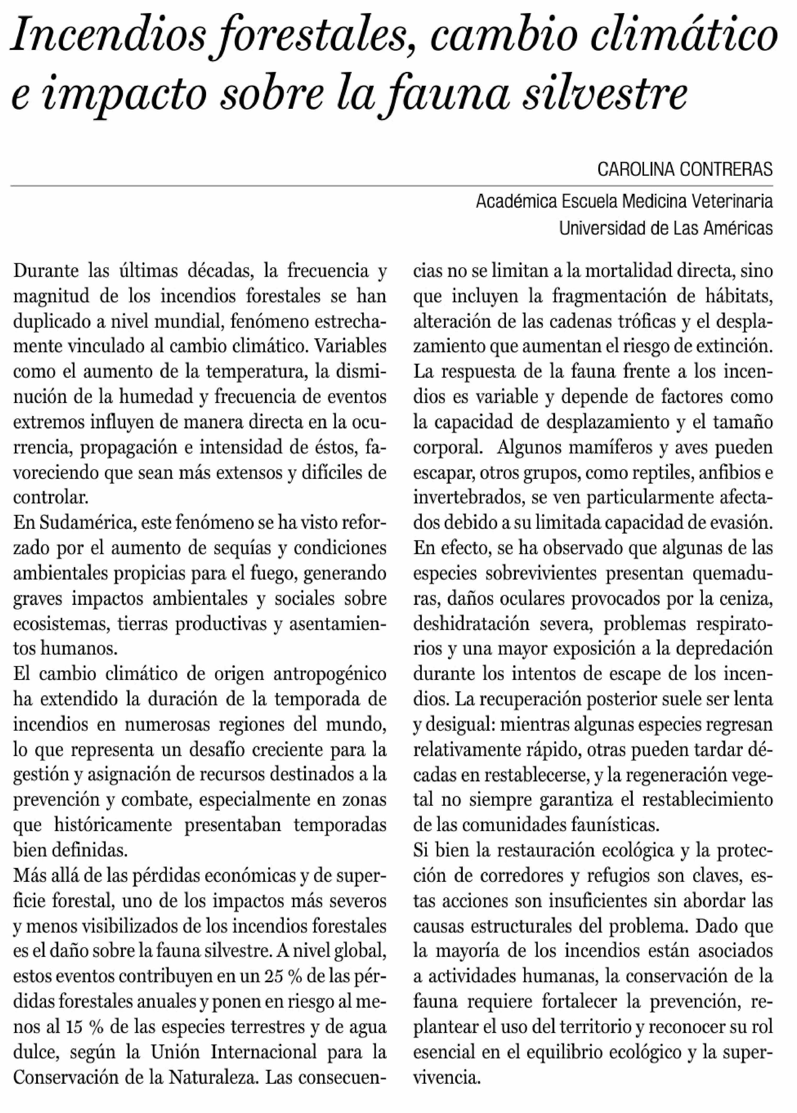 Cartas: Incendios forestales, cambio climático e impacto sobre la fauna silvestre 03-02-2026 La Prensa de Curicó |