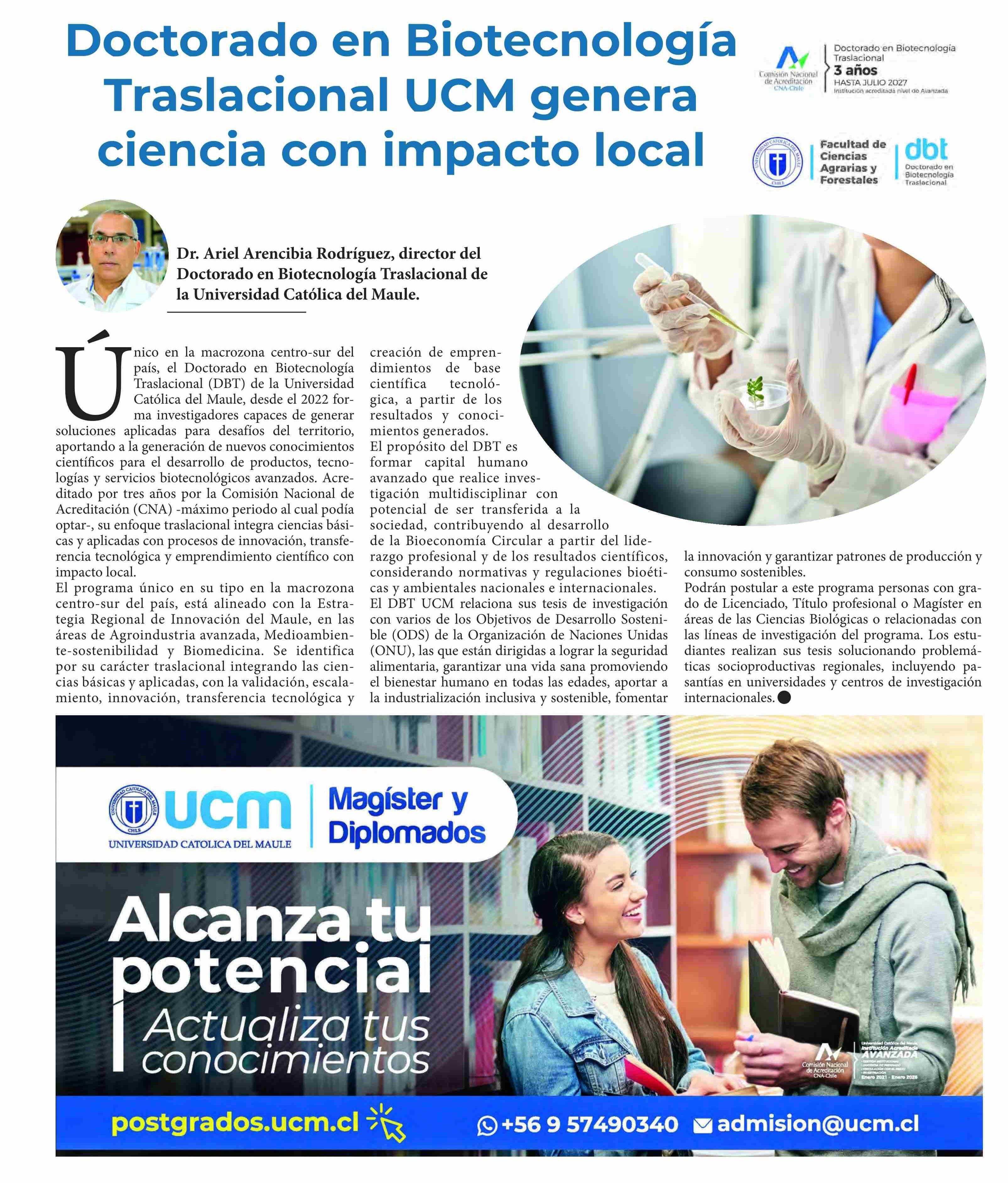 COLUMNAS DE OPINIÓN: Doctorado en Biotecnología Traslacional UCM genera ciencia con impacto local 09-06-2025 Diario Talca |