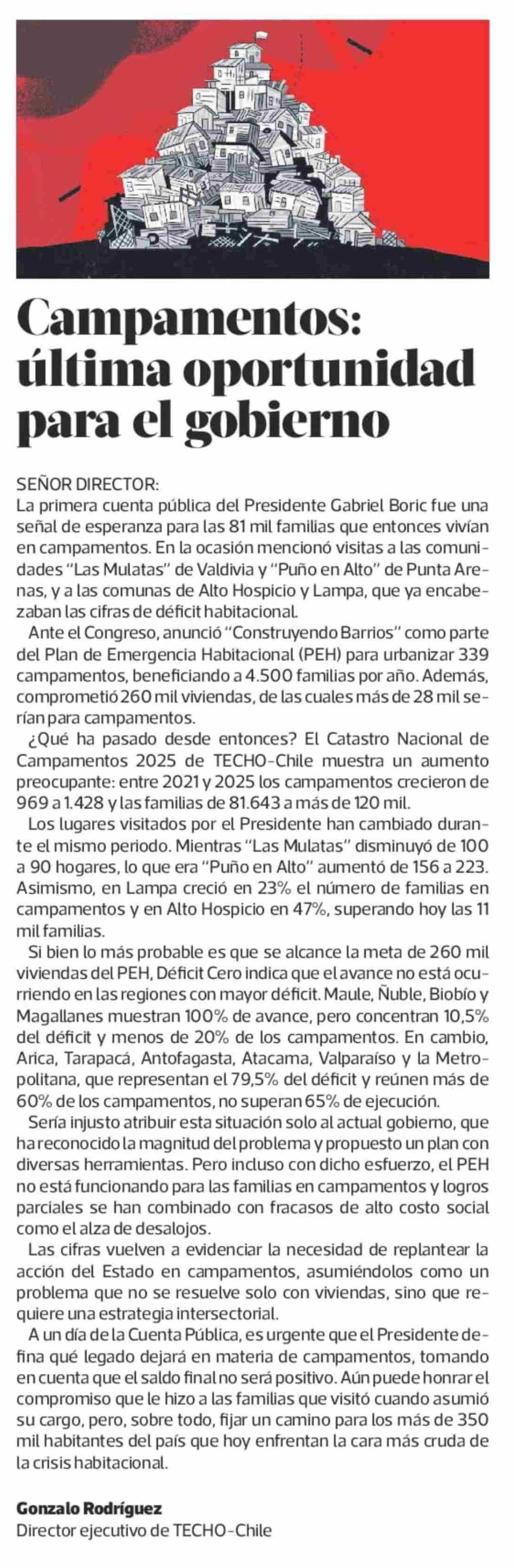 CARTAS: Campamentos: última oportunidad para el gobierno 31-05-2025 La Tercera |