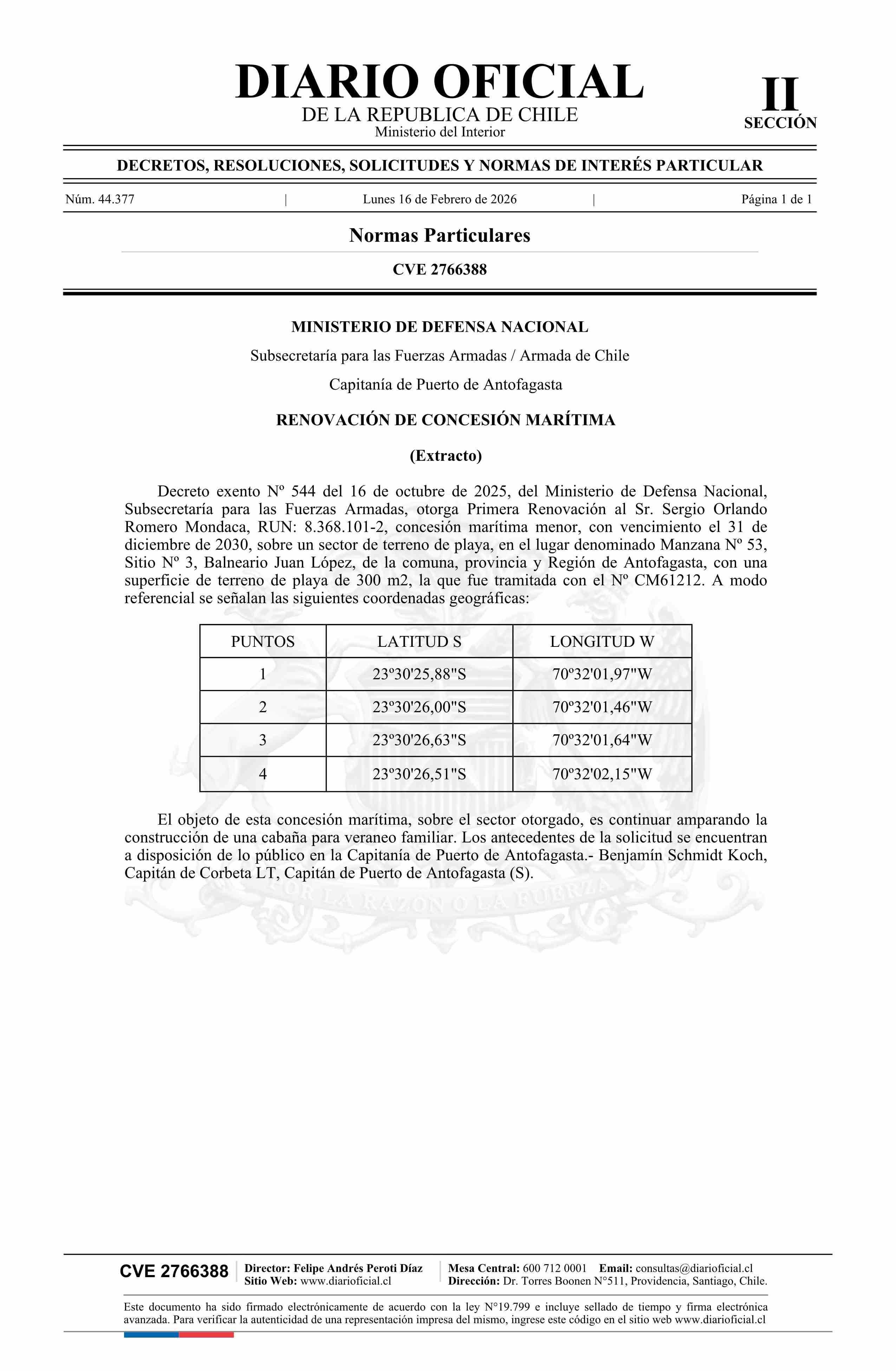 Extracto de decreto exento número 544, de 2025.- Renovación de concesión marítima 16-02-2026 Diario Oficial Edición Electrónica |