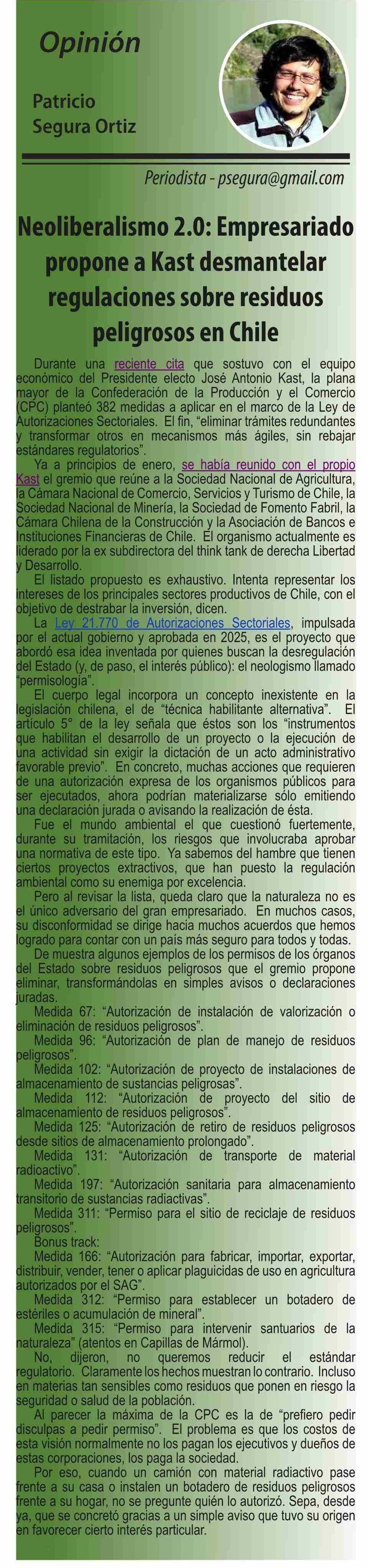 Columnas de Opinión: Neoliberalismo 2.0: Empresariado propone a Kast desmantelar regulaciones sobre residuos peligrosos en Chile 20-01-2026 El Divisadero |