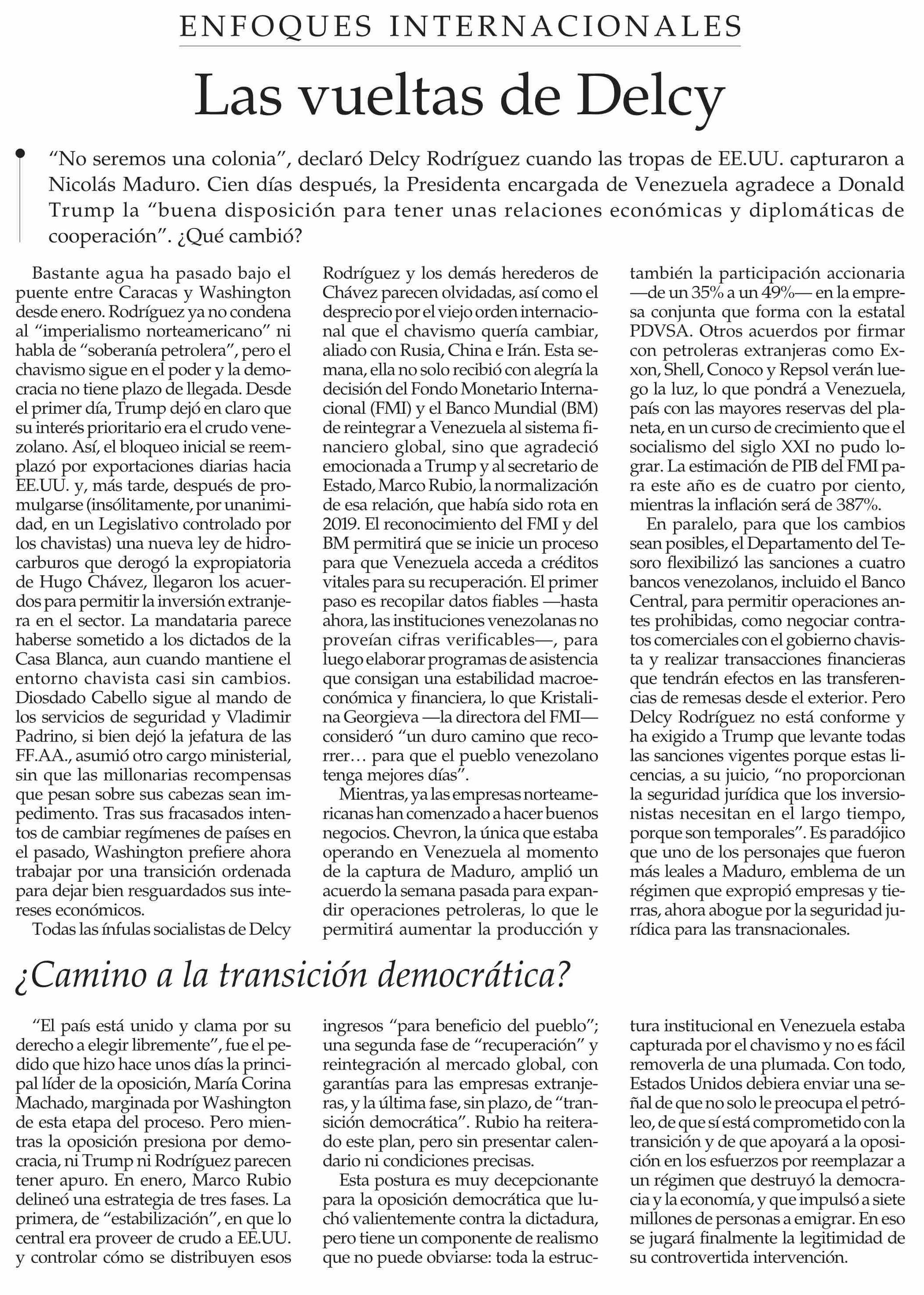 Editorial: Las vueltas de Delcy 20-04-2026 El Mercurio |