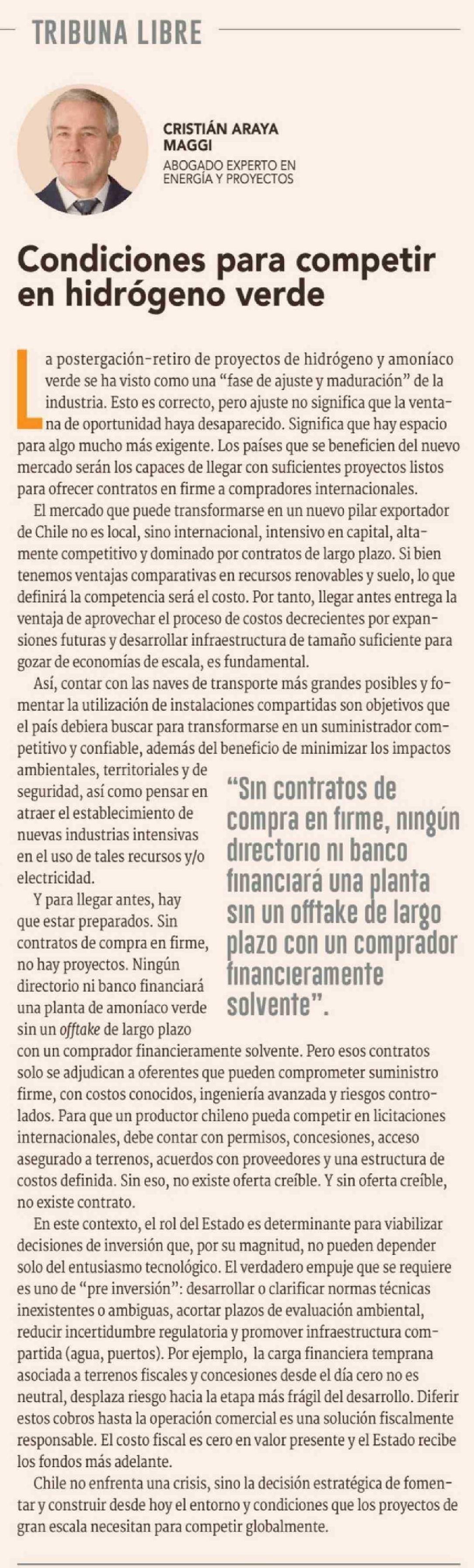 Columnas de Opinión: Condiciones para competir en hidrógeno verde 16-02-2026 Diario Financiero |