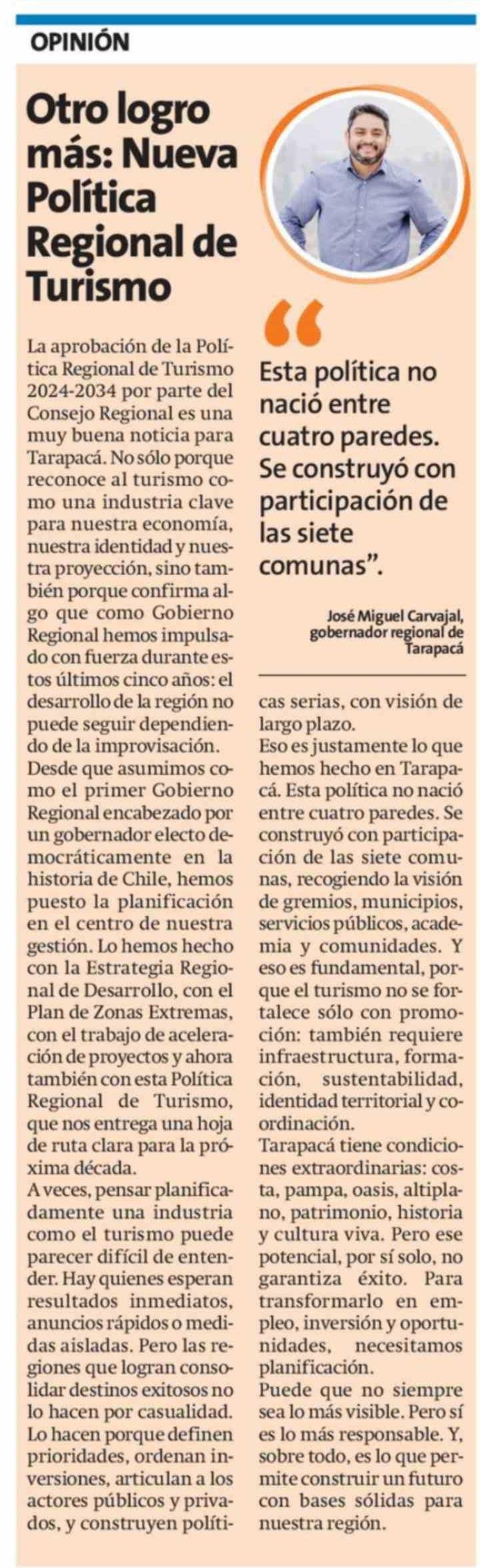 Columnas de Opinión: Otro logro más: Nueva Política Regional de Turismo 16-03-2026 La Estrella de Iquique |