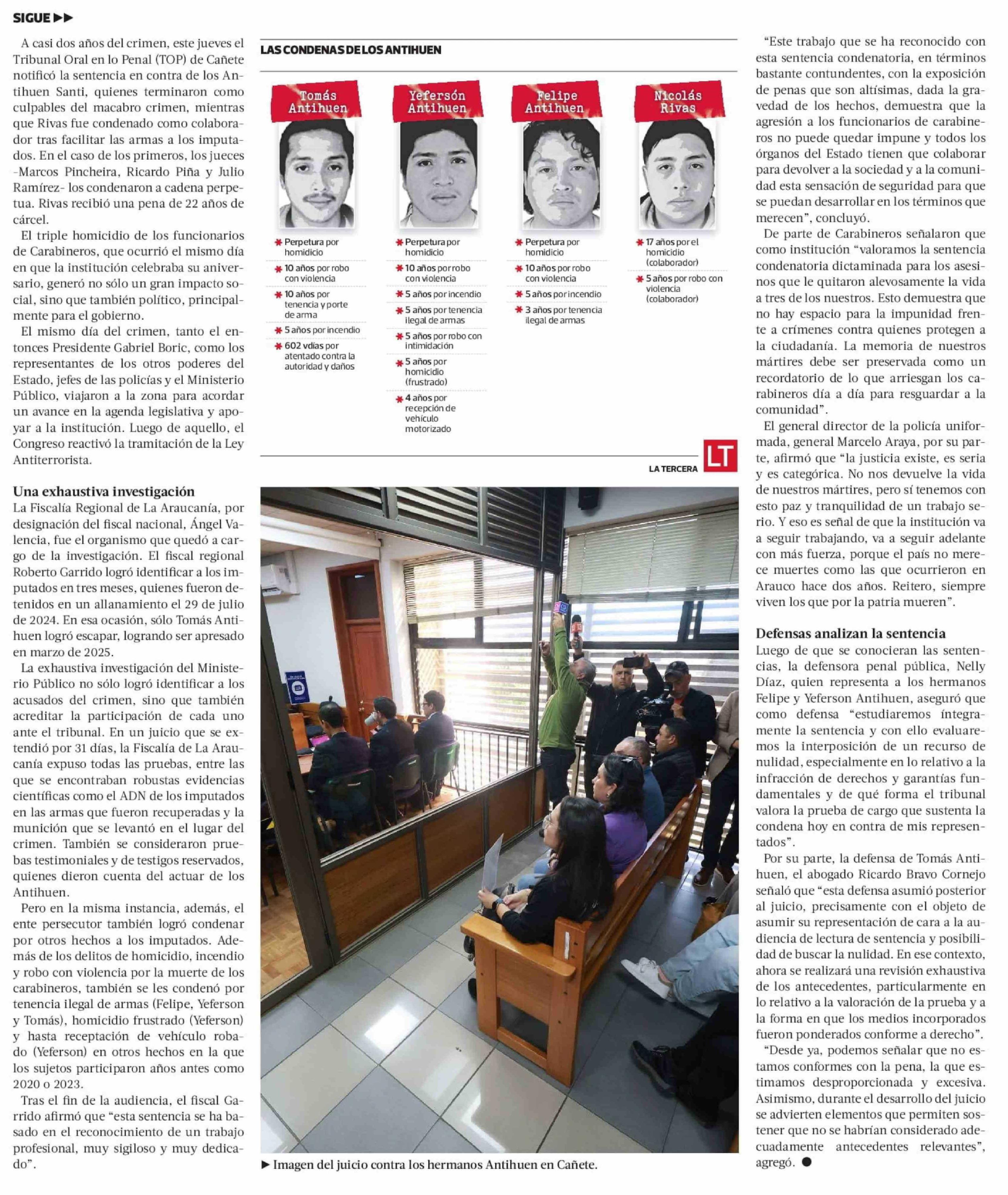 Triple homicidio de carabineros en Cañete termina con una pena de cadena perpetua para los hermanos Antihuen 27-03-2026 La Tercera |