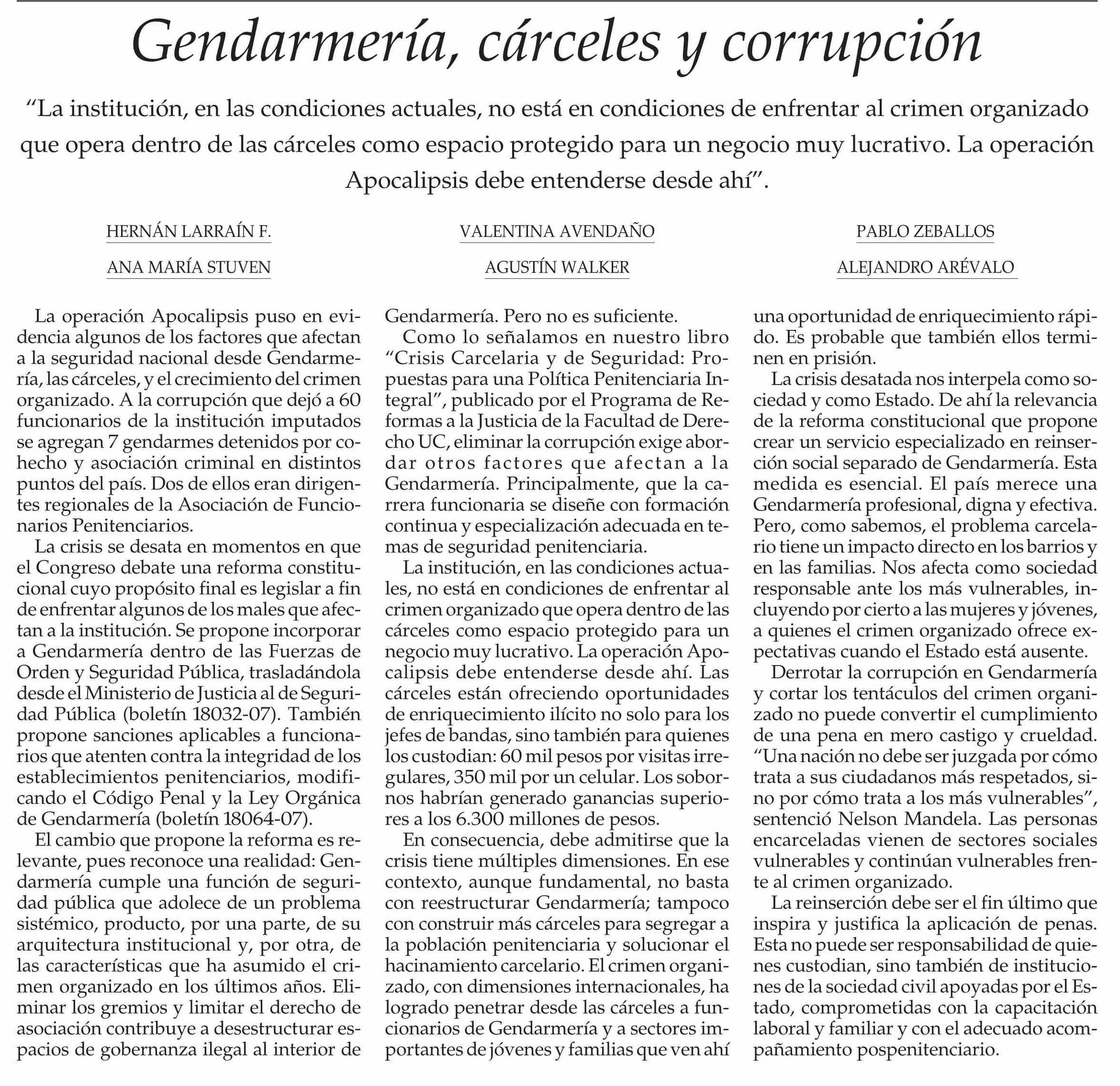 Columnas de Opinión: Gendarmería, cárceles y corrupción 30-01-2026 El Mercurio |