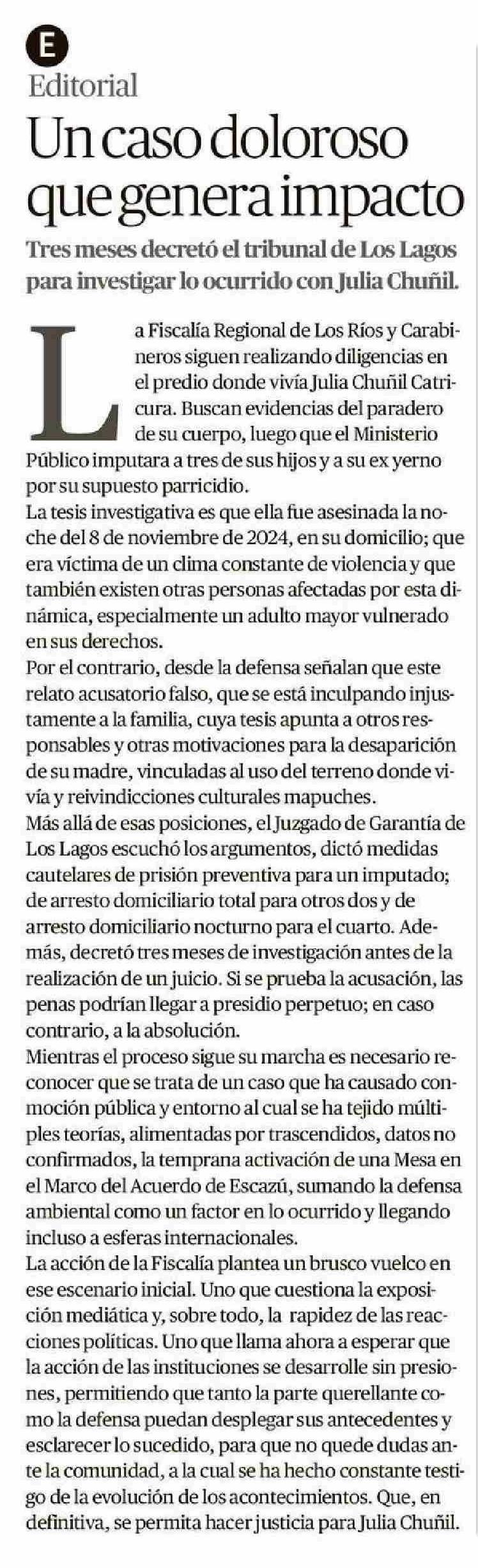 Editorial: Un caso doloroso que genera impacto 22-01-2026 Diario Austral Región de Los Ríos |