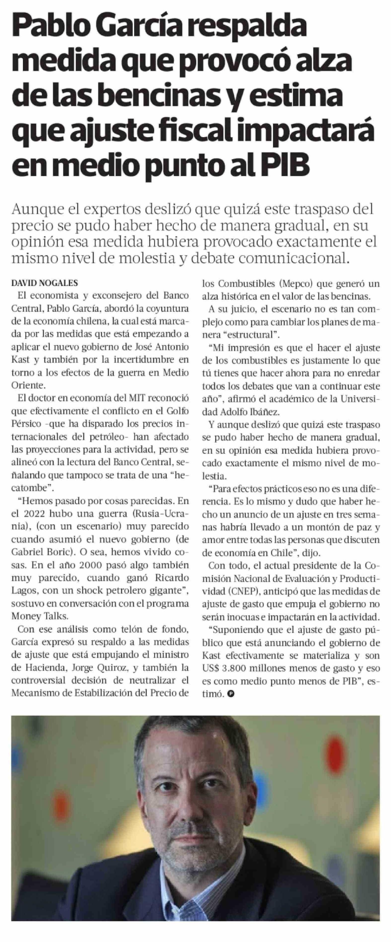 Pablo García respalda medida que provocó alza de las bencinas y estima que ajuste fiscal impactará en medio punto al PIB 02-04-2026 La Tercera |