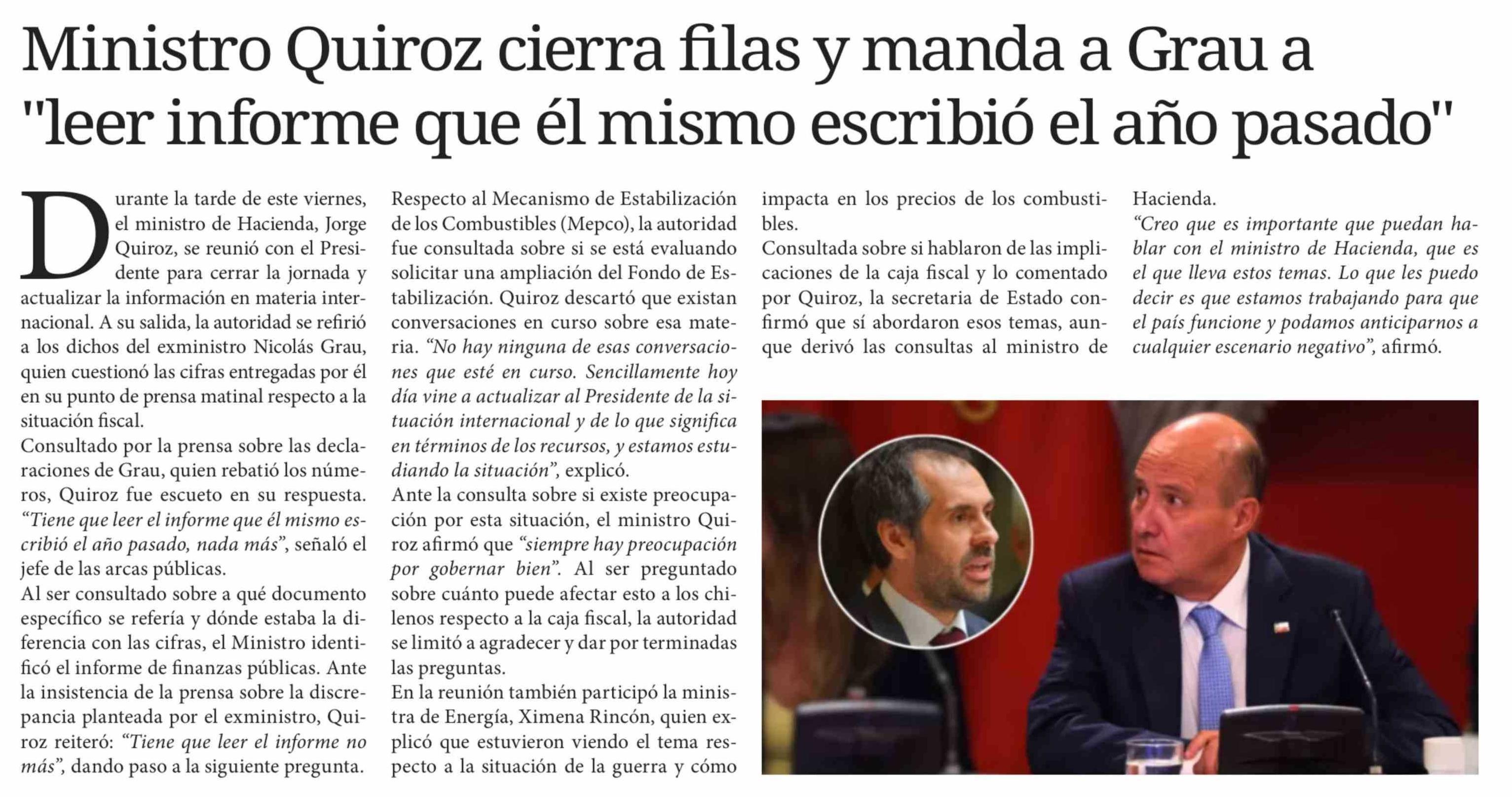 Ministro Quiroz cierra filas y manda a Grau a "leer informe que el mismo escribió el año pasado" 15-03-2026 Diario Chañarcillo |