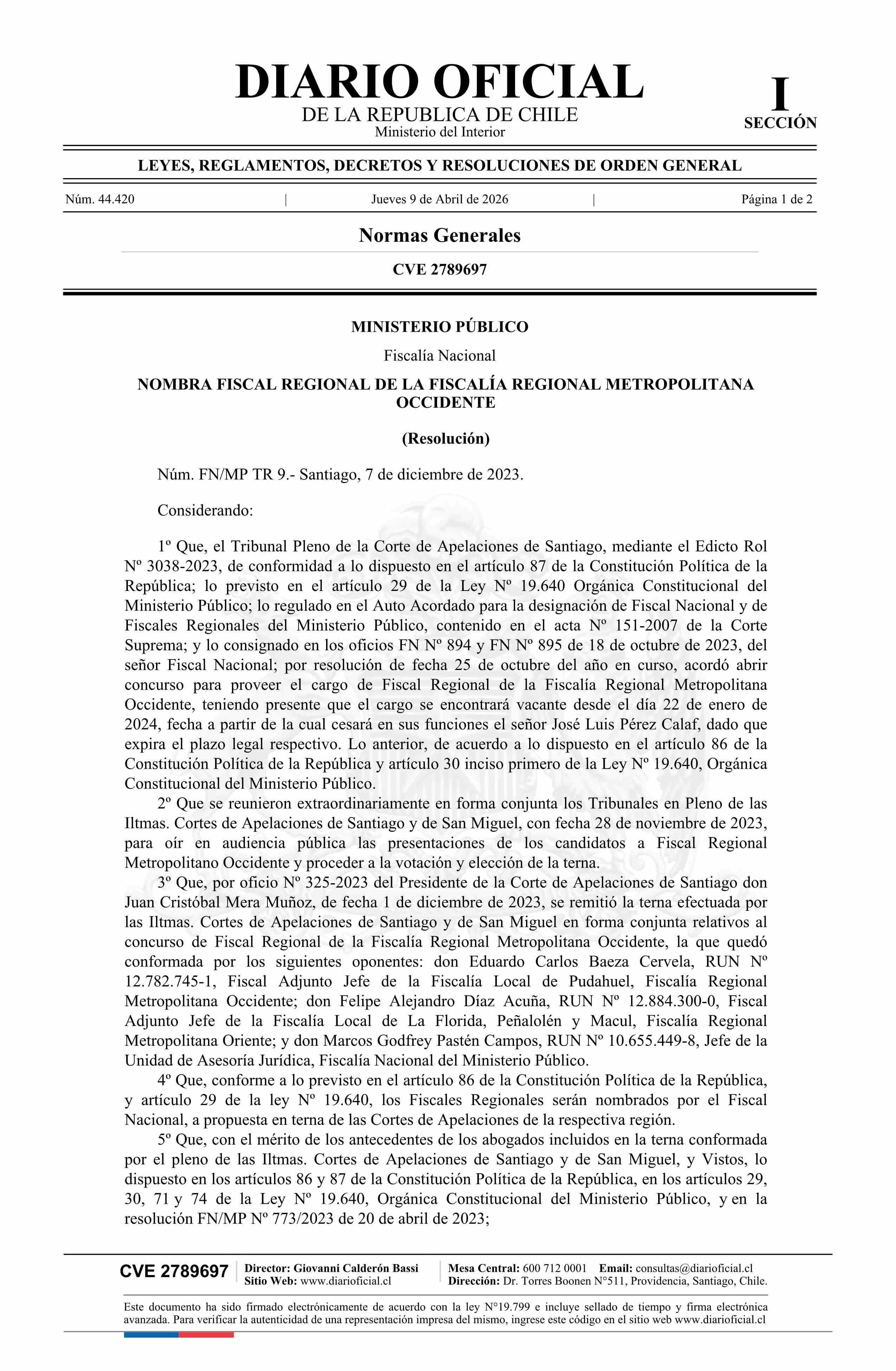 Título: Resolución número TR 9, de 2023.- Nombra a don Marcos Godfrey Pastén Campos en el cargo de Fiscal Regional de la Fiscalía Regional Metropolitana Occidente