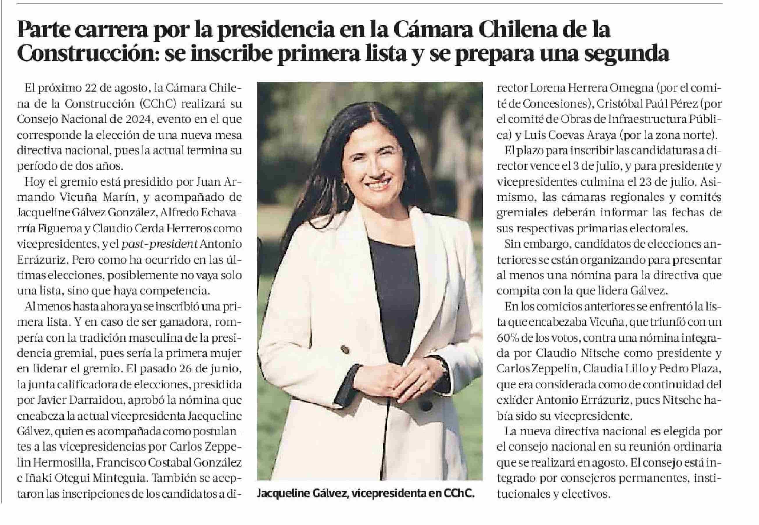 Parte carrera por la presidencia en la Cámara Chilena de la Construcción: se inscribe primera lista y se prepara una segunda 29-06-2024 La Tercera |
