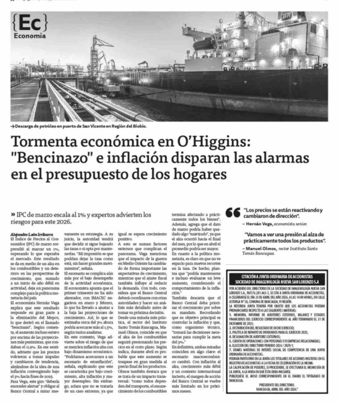 Tormenta económica en O'Higgins: "Bencinazo" e inflación disparan las alarmas en el presupuesto de los hogares 09-04-2026 El Tipógrafo |