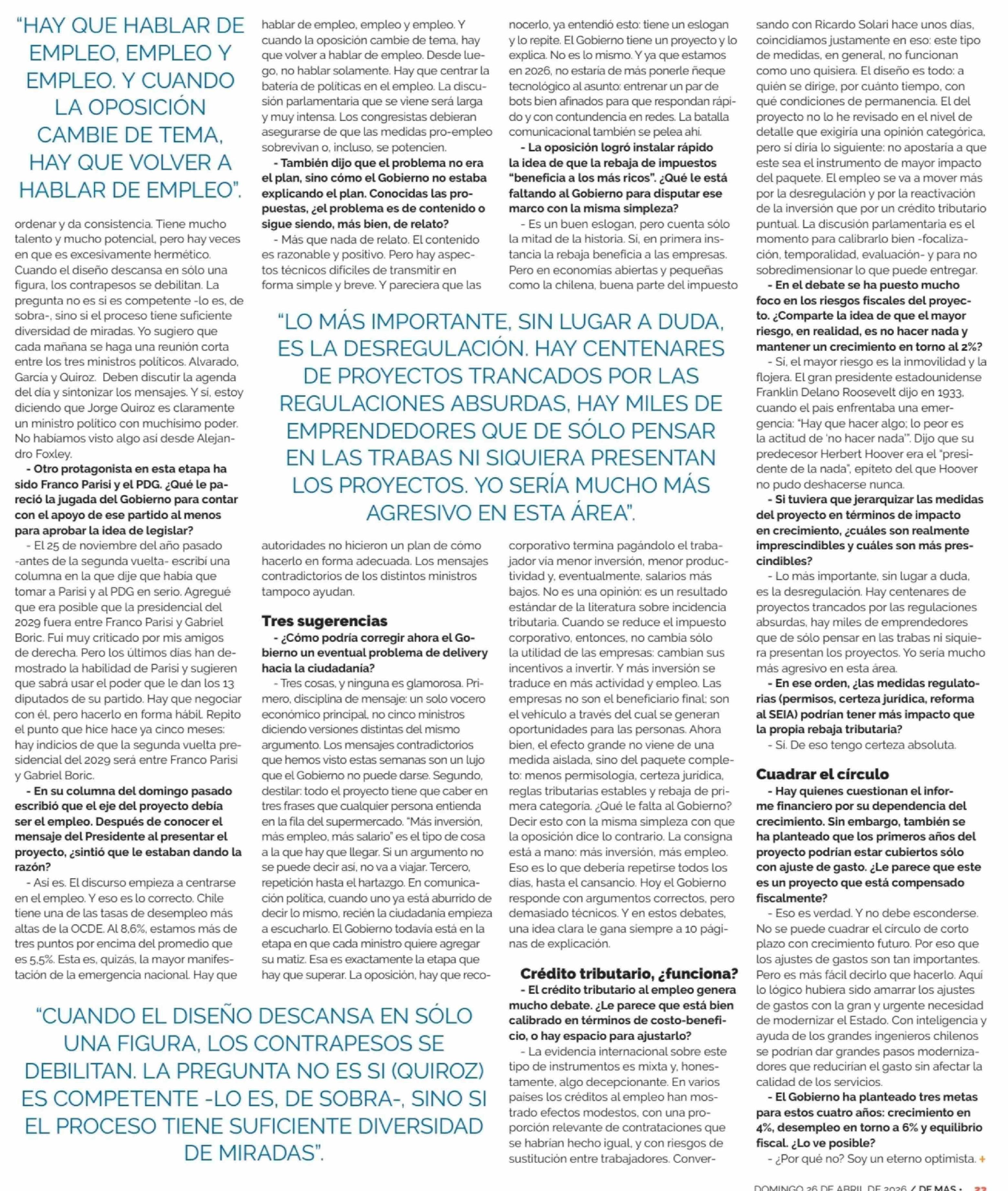 SEBASTIÁN EDWARDS: "JORGE QUIROZ ES CLARAMENTE UN MINISTRO POLÍTICO CON MUCHÍSIMO PODER. NO HABÍAMOS VISTO ALGO ASÍ DESDE ALEJANDRO FOXLEY" 26-04-2026 Diario Financiero |