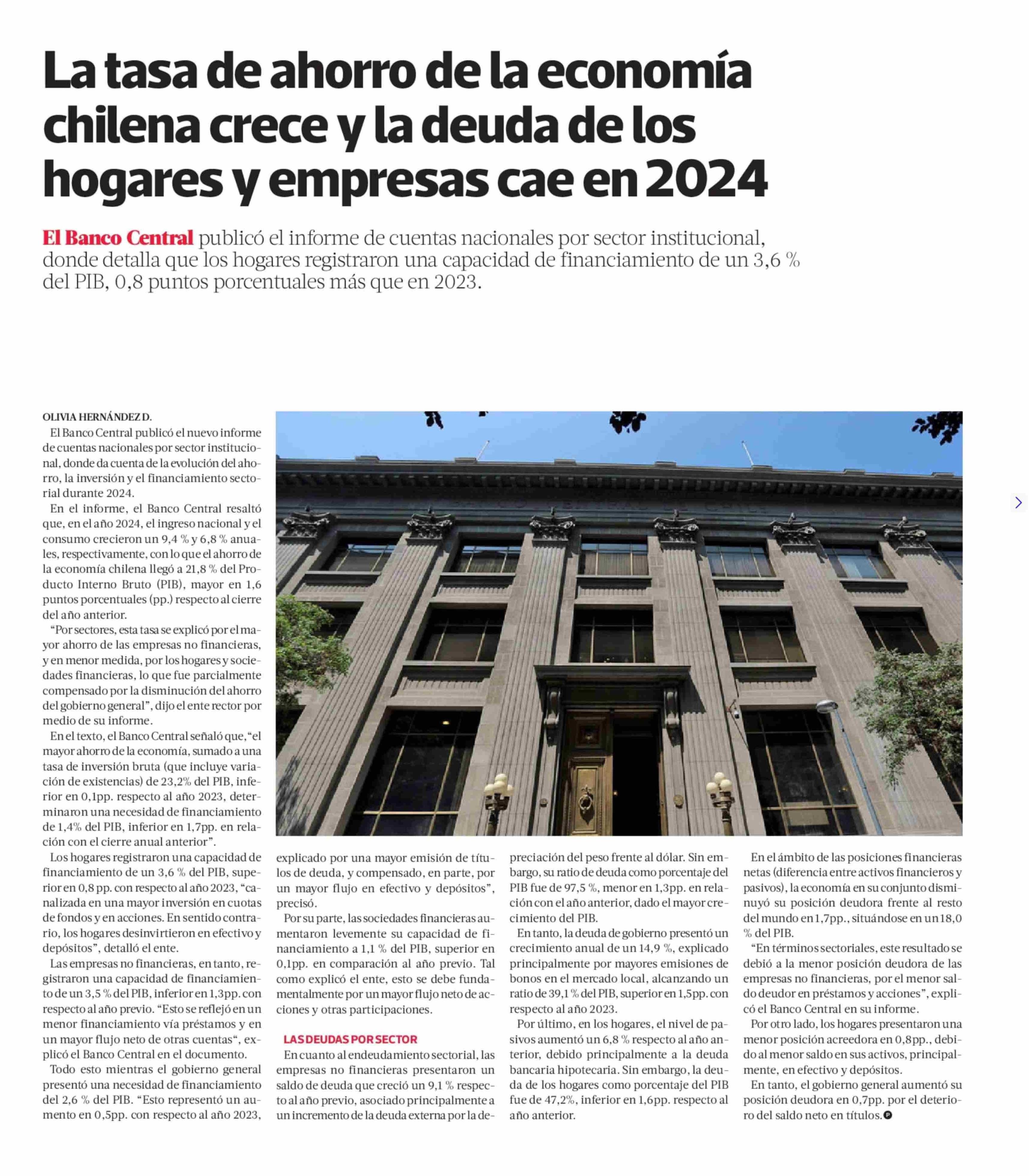 La tasa de ahorro de la economía chilena crece y la deuda de los hogares y empresas cae en 2024 22-04-2025 La Tercera |