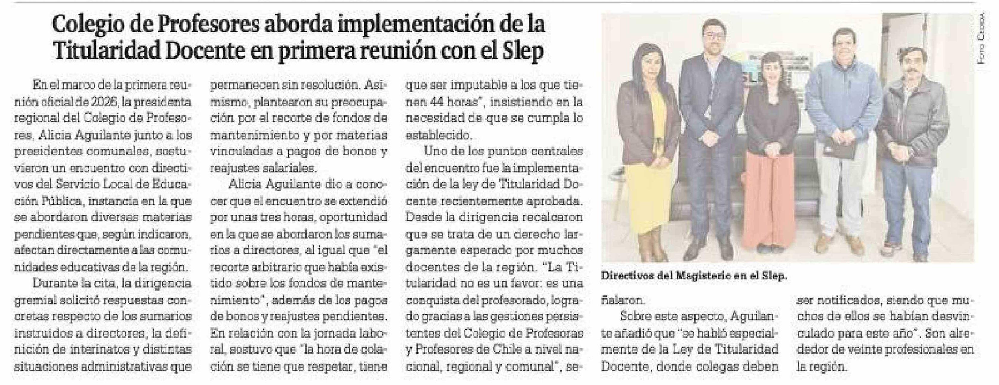 Colegio de Profesores aborda implementación de la Titularidad Docente en primera reunión con el Slep 04-03-2026 La Prensa Austral |