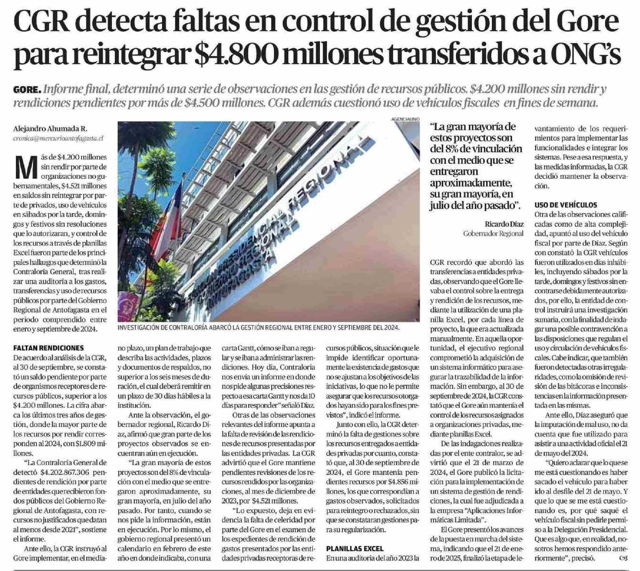 CGR detecta faltas en control de gestión del Gore para reintegrar $4.800 millones transferidos a ONGS 05-06-2025 El Mercurio de Calama |