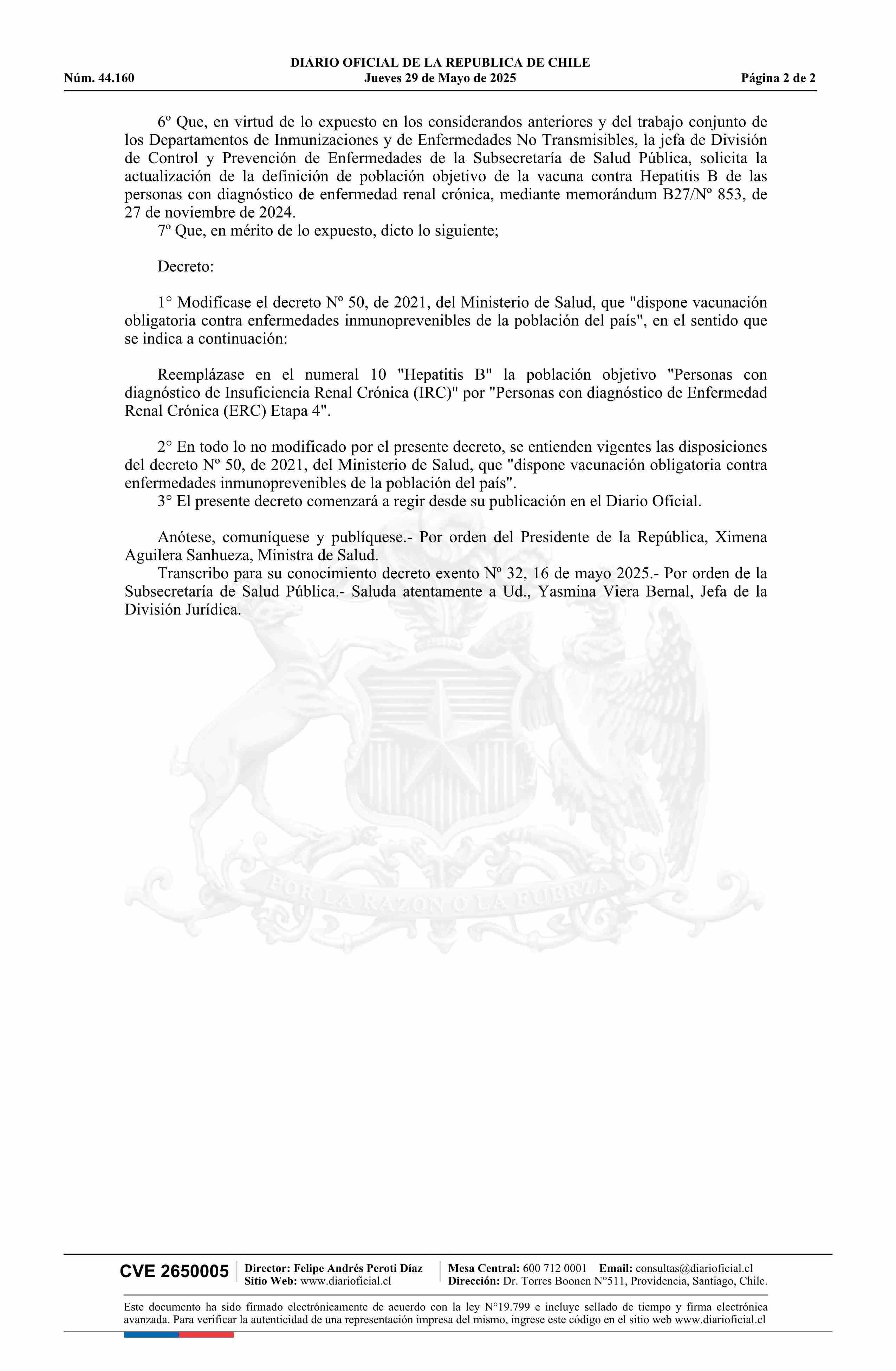 Decreto exento número 32, de 2025.- Modifica decreto Nº 50 exento, de 2021, que dispone vacunación obligatoria contra enfermedades inmunoprevenibles de la población del país 29-05-2025 Diario Oficial Edición Electrónica |