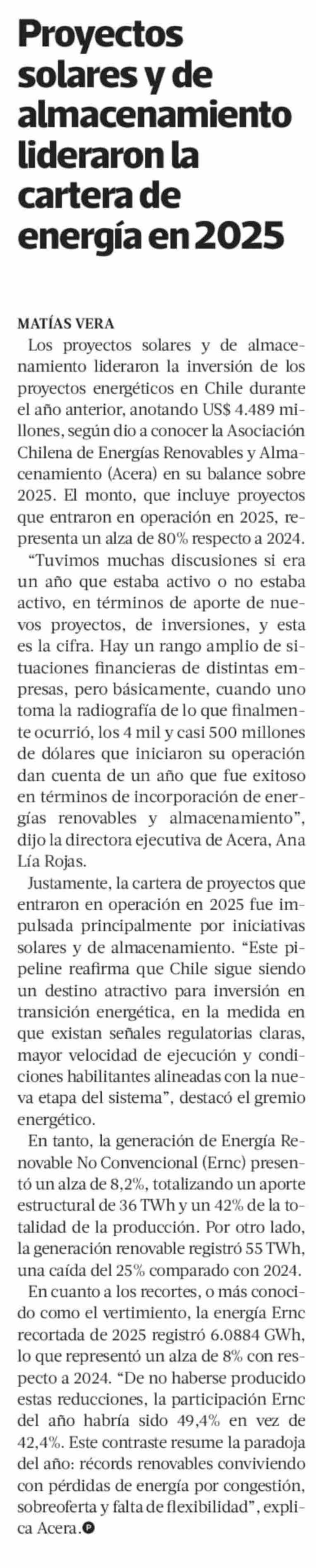 Proyectos solares y de almacenamiento lideraron la cartera de energía en 2025 08-01-2026 La Tercera |