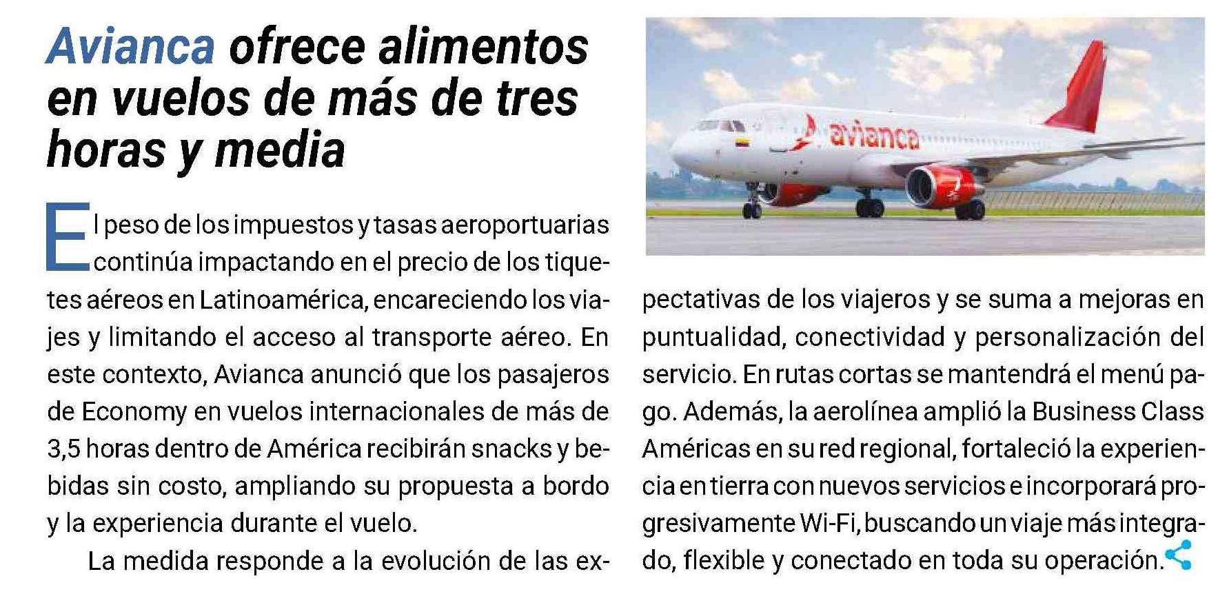 Avianca ofrece alimentos en vuelos de más de tres horas y media 13-04-2026 Revista La Agencia de Viajes |