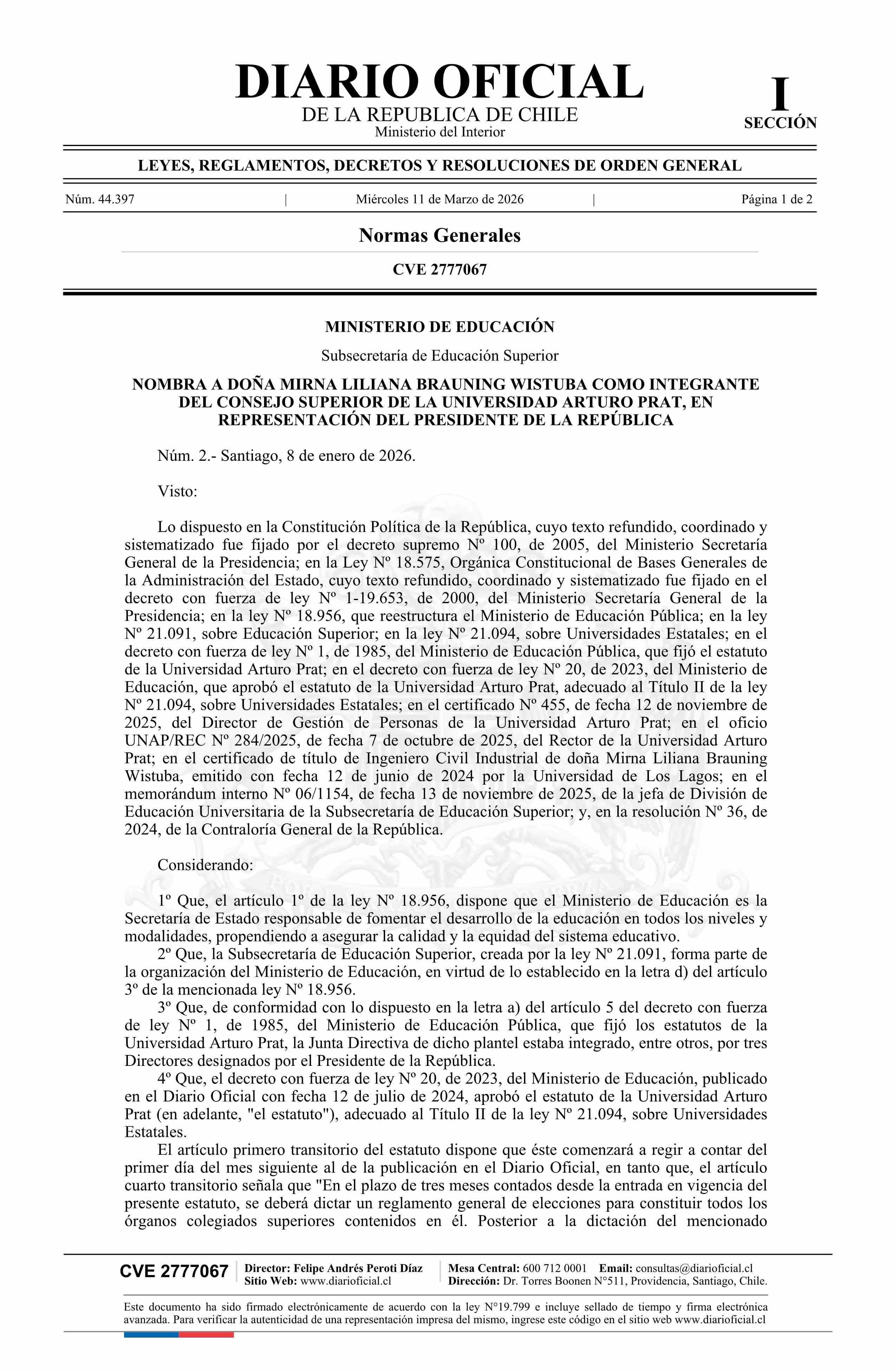 Decreto número 2, de 2026.- Nombra a doña Mirna Liliana Brauning Wistuba como integrante del Consejo Superior de la Universidad Arturo Prat, en representación del Presidente de la República