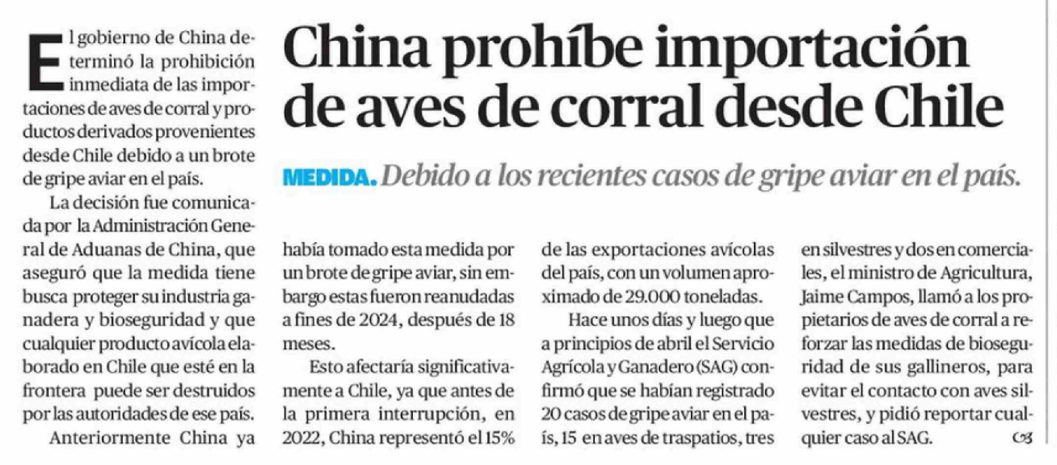 | Título: | China prohíbe importación de aves de corral desde Chile |