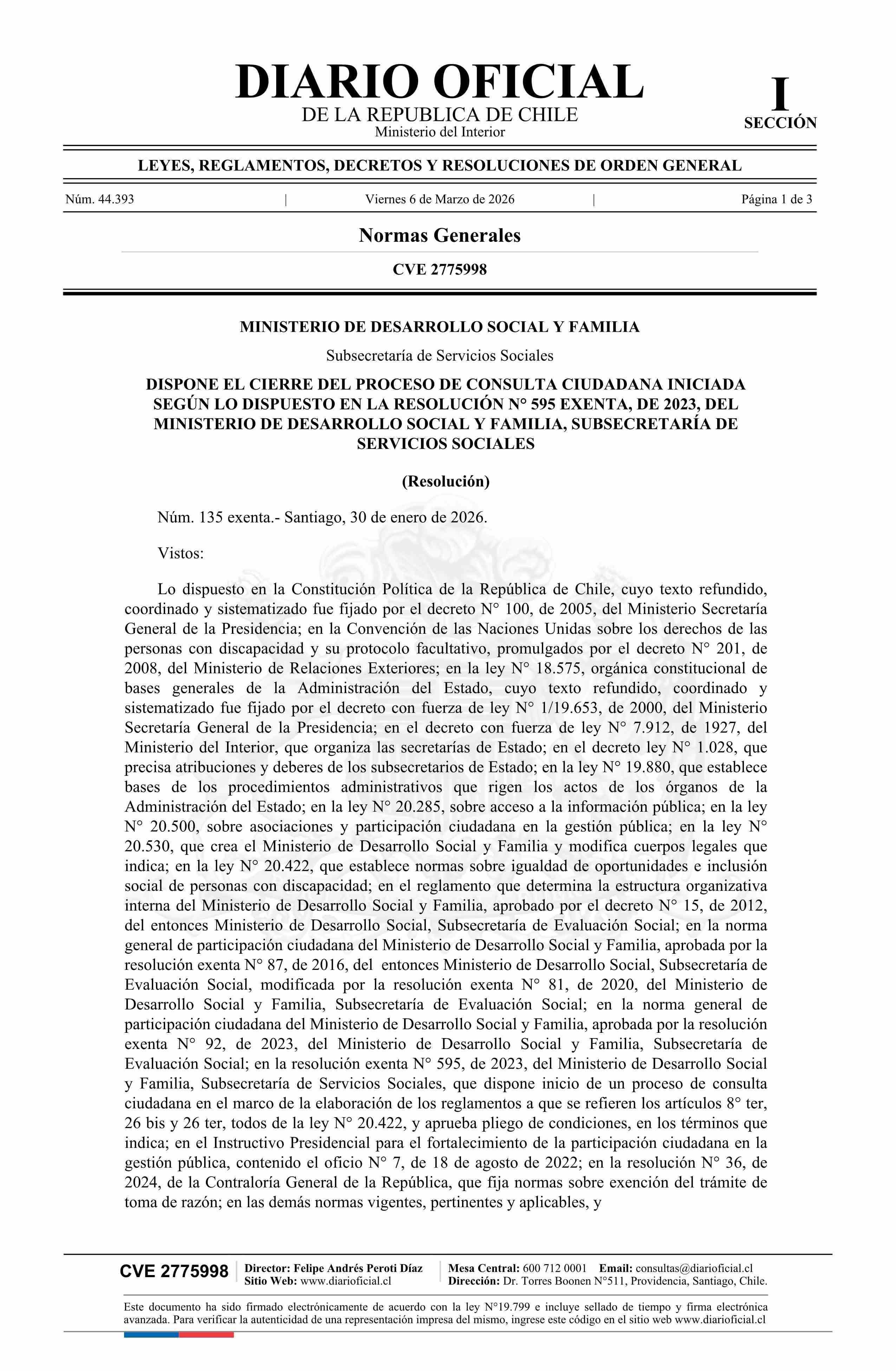 Título: Resolución exenta número 135, de 2026.- Dispone el cierre del proceso de consulta ciudadana iniciada según lo dispuesto en la resolución N° 595 exenta, de 2023