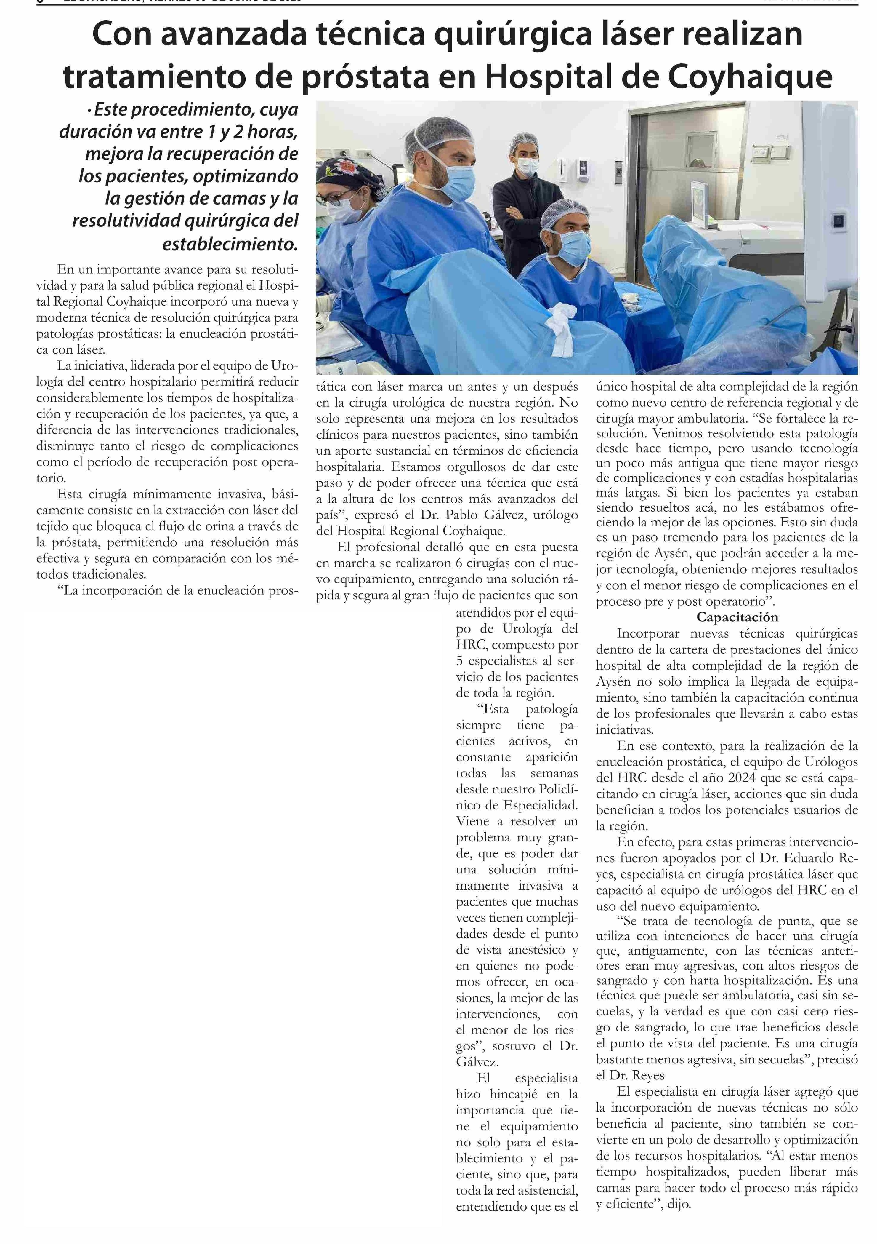 Con avanzada técnica quirúrgica láser realizan tratamiento de próstata en Hospital de Coyhaique 06-06-2025 El Divisadero |
