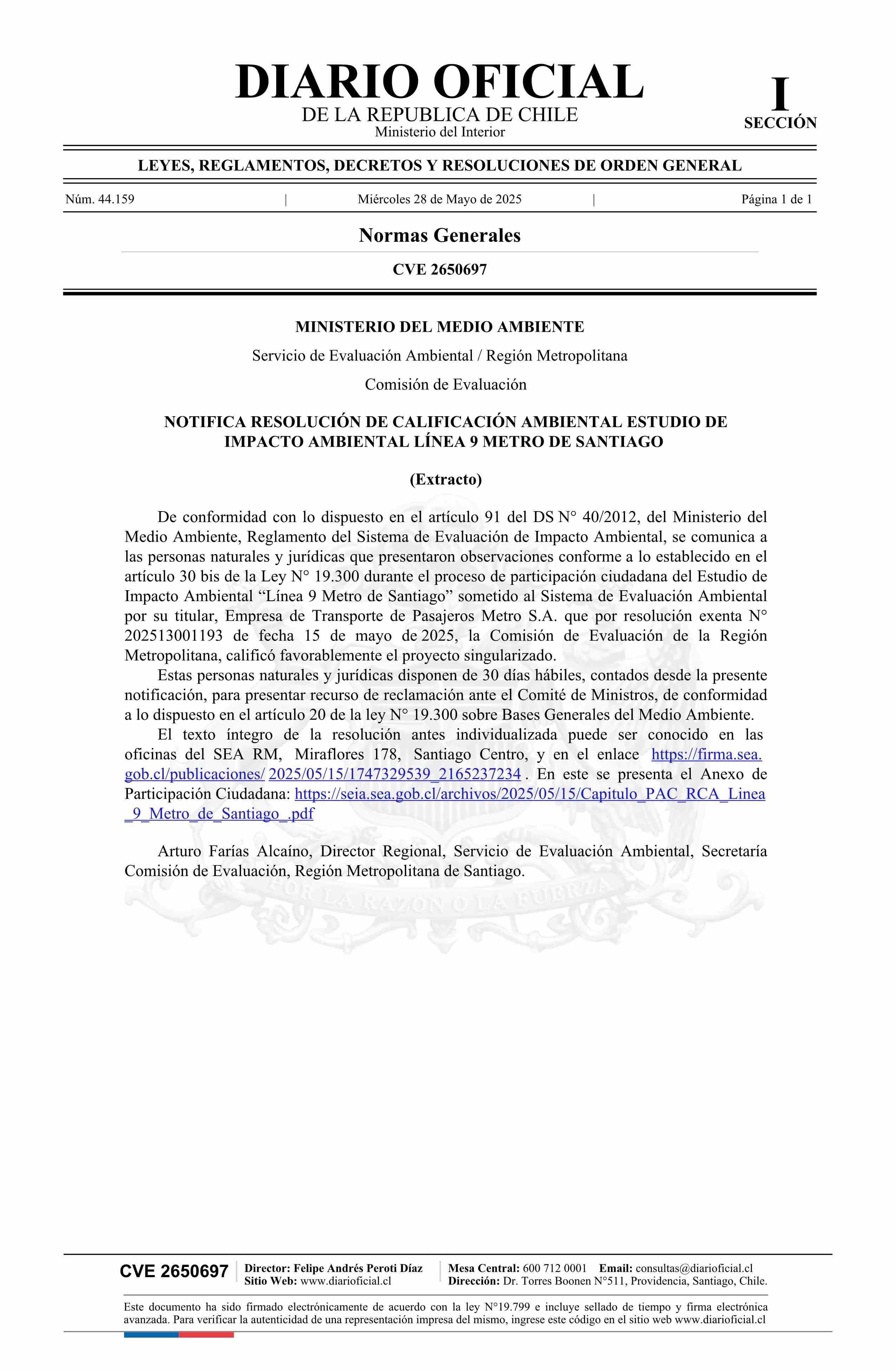 | Título: | Extracto de resolución exenta número 202513001193, de 2025.- Notifica Resolución de Calificación Ambiental de Estudio de Impacto Ambiental Línea 9 Metro de Santiago |